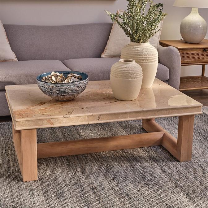 This table's polished marble top complements its solid wooden legs for a color scheme that highlights the subtle tonal variations of the two natural materials. With its architectural silhouette, this piece combines soft curves and sharp lines to create a gorgeous framework for the unique veining and patterning of its creamy marble and wooden base. Evoke a serene yet tactile aesthetic with this coffee table's soft tones and inviting feel. Our Trapezi coffee table is the perfect addition to your living room, providing effortless style and practicality.