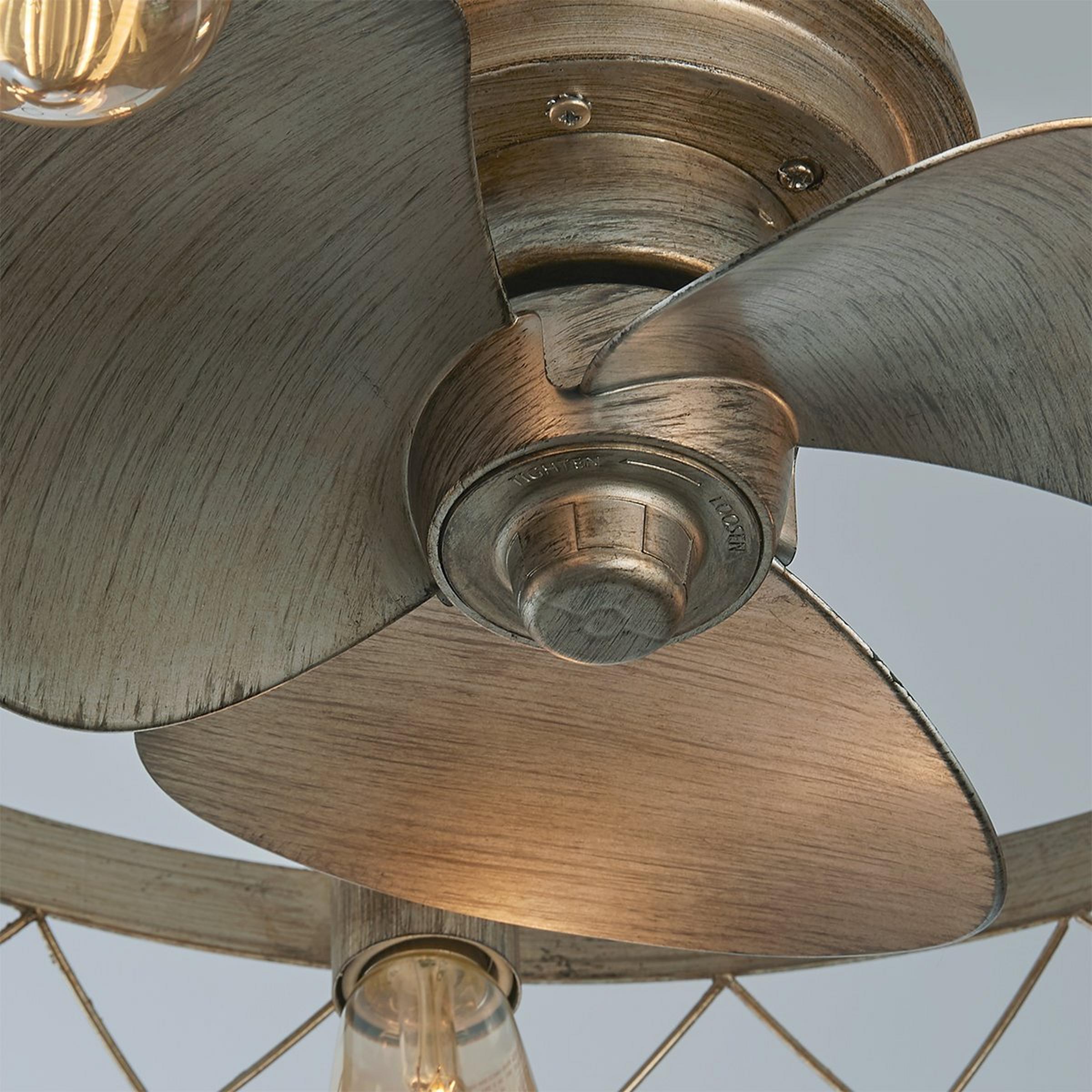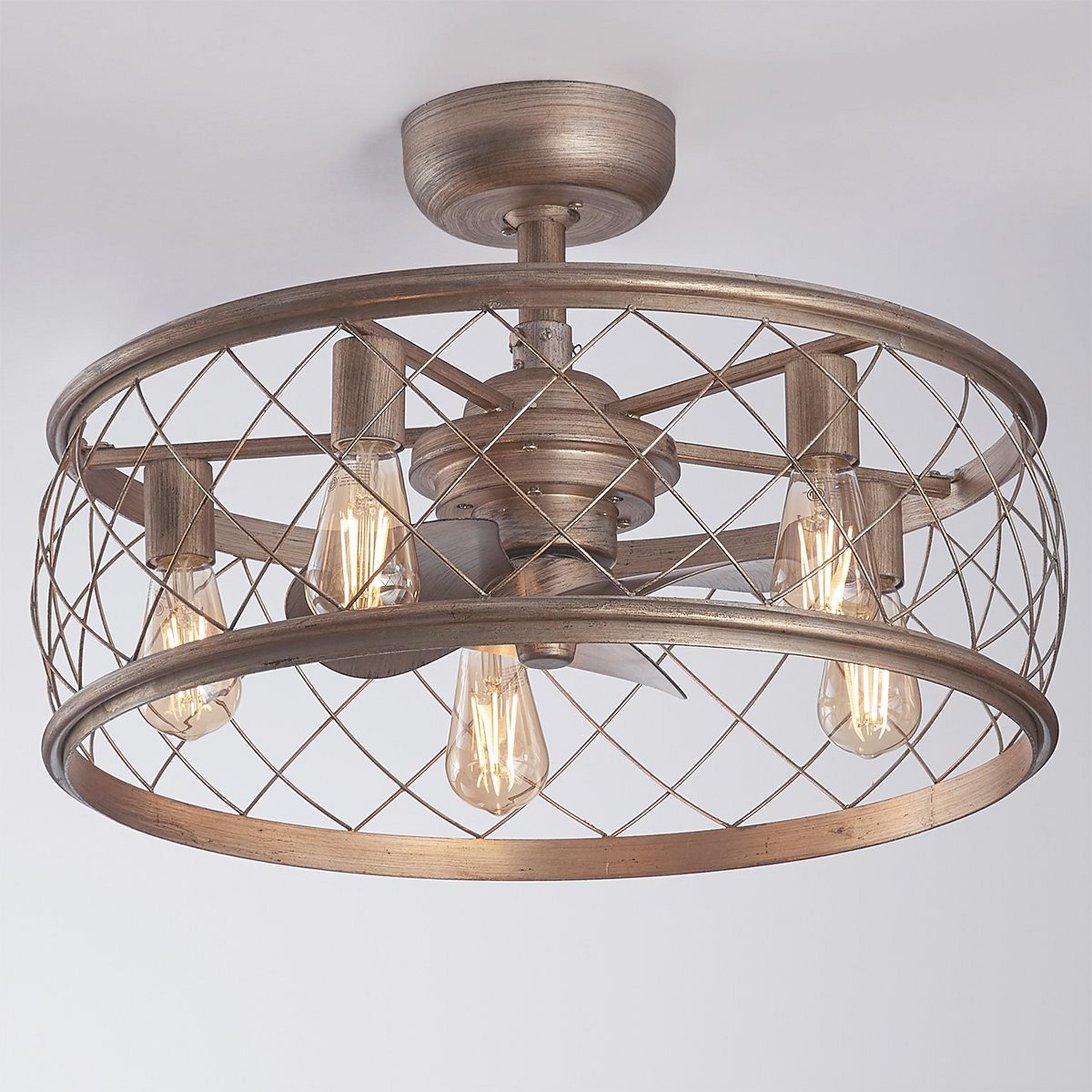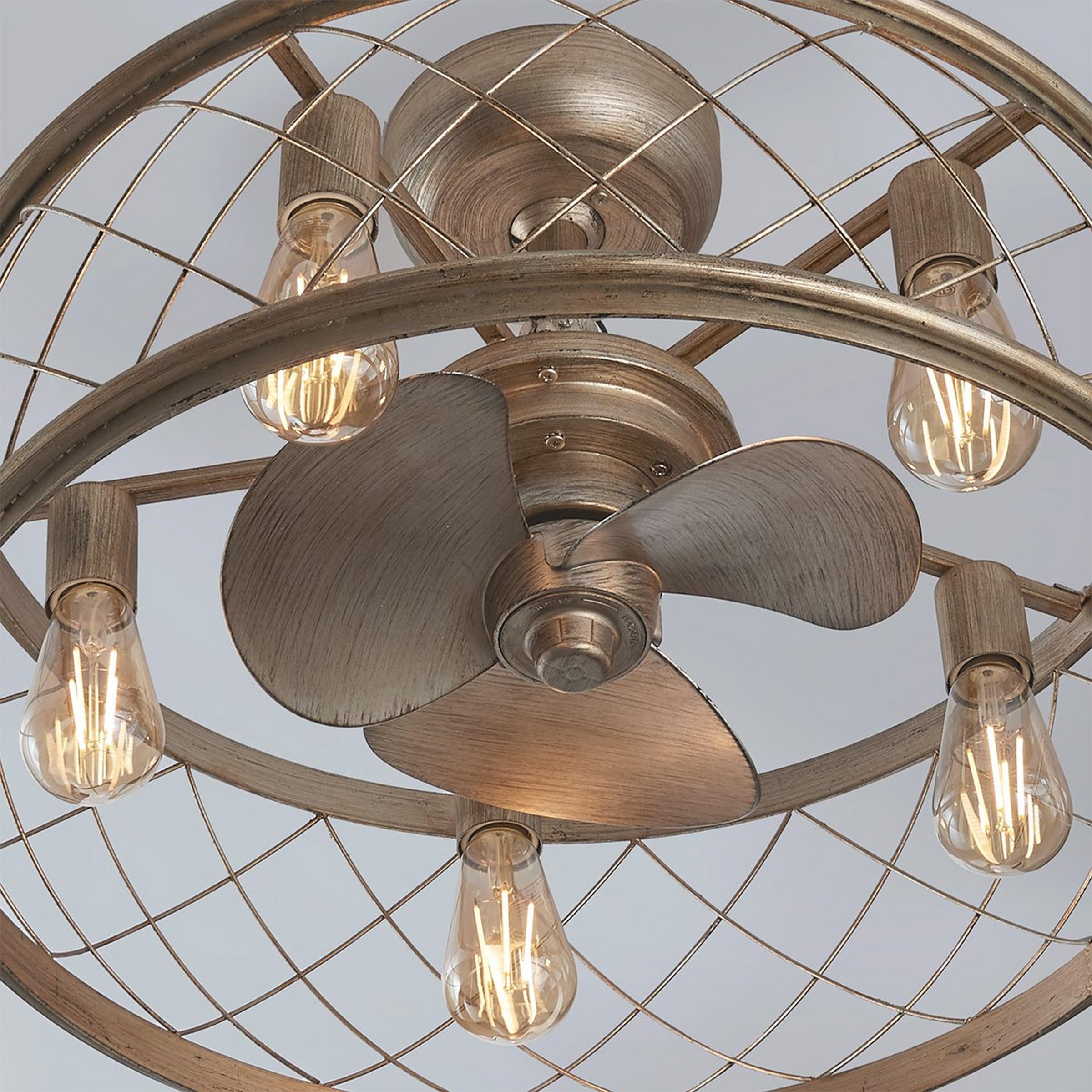 A European design with versatile appeal, this lattice cage ceiling fan adds subdued sparkle and vibrant style. The crossed frame of this fixture creates visual interest sure to complement all types of decor. Due to the nature of the Distressed Champagne finish, no two fixtures in this finish variant will appear exactly alike; the champagne may appear more silver or more gold depending upon the lighting, color palette, and decor of the room the fixture is placed in, making it a wonderful addition to eclectic, boho, and rustic spaces in need of a touch of glamour. Steel frame with ABS blades.