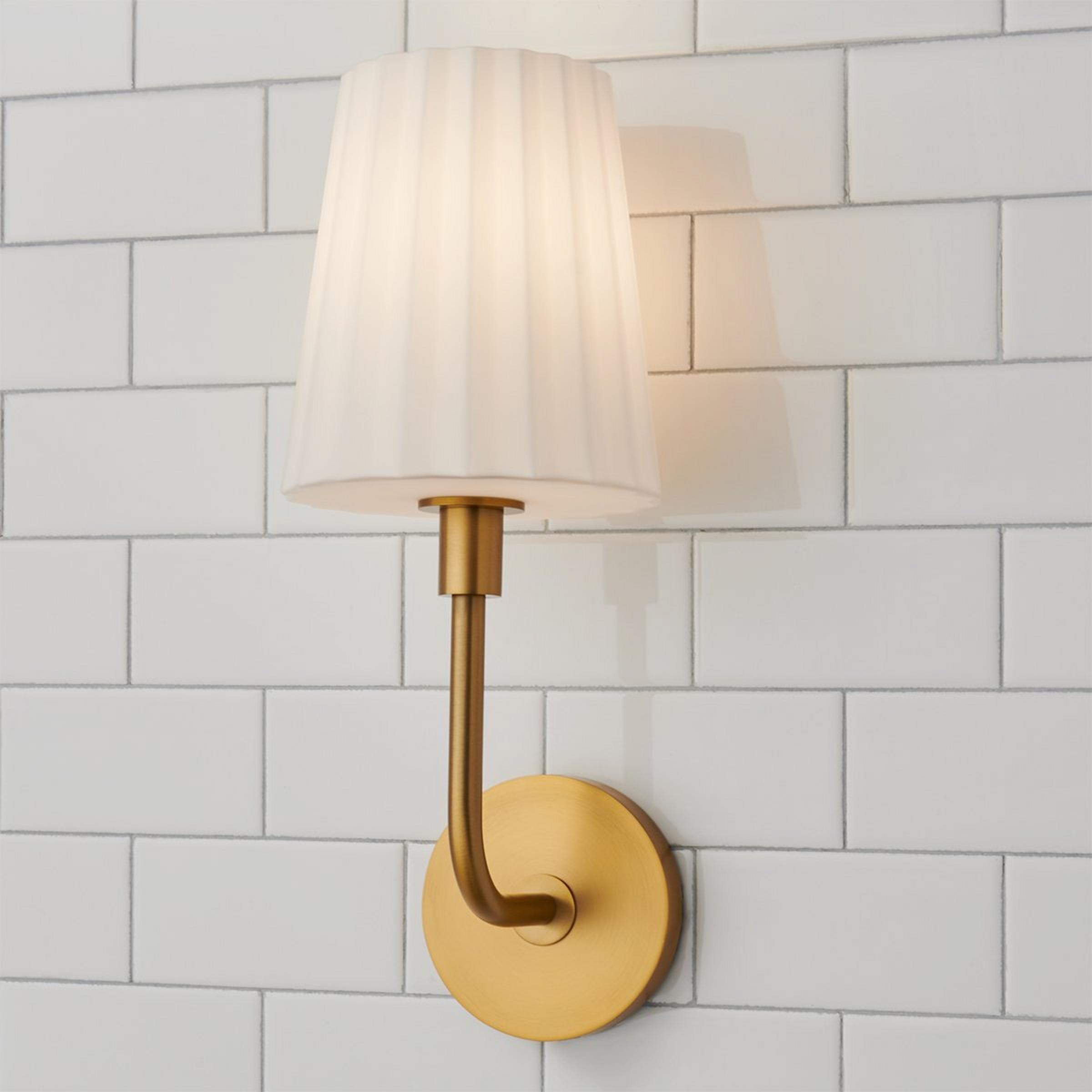 Capture the essence of vintage refinement with our Trysania Bath Sconce. A single arm swoops up to an eye-catching pleated opal glass shade, striking a balance between traditional and modern design.