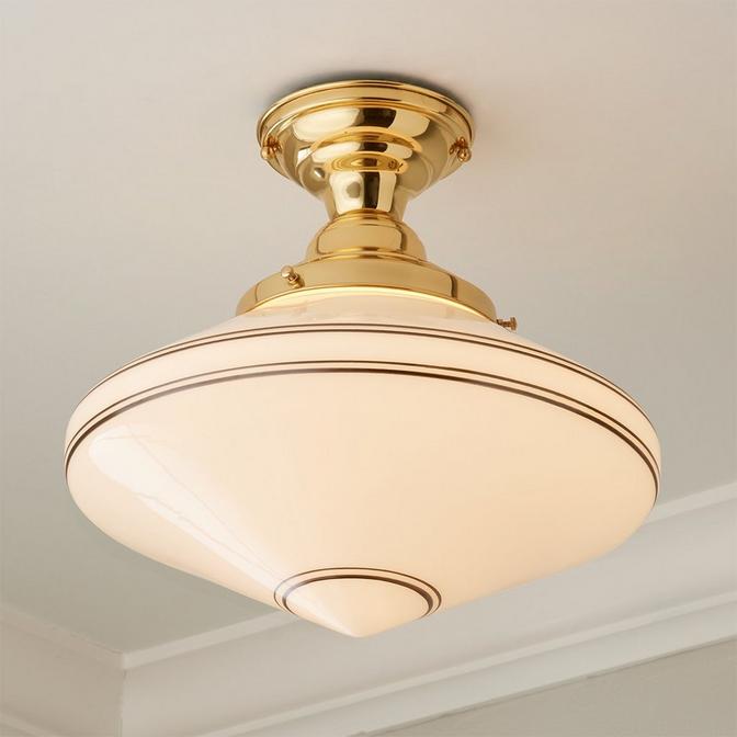 Inspired by the fittings and fixtures at a 1920's brasserie. Polished solid brass hardware blends with sculptural white opal glass punctuated by a clean black pinstripe. This ceiling light would be the perfect addition to a glamourous powder room or repeated down a hallway. This ceiling light is assembled by hand in our Richmond, Virginia production facility using solid brass hardware and glass that is made in the USA.