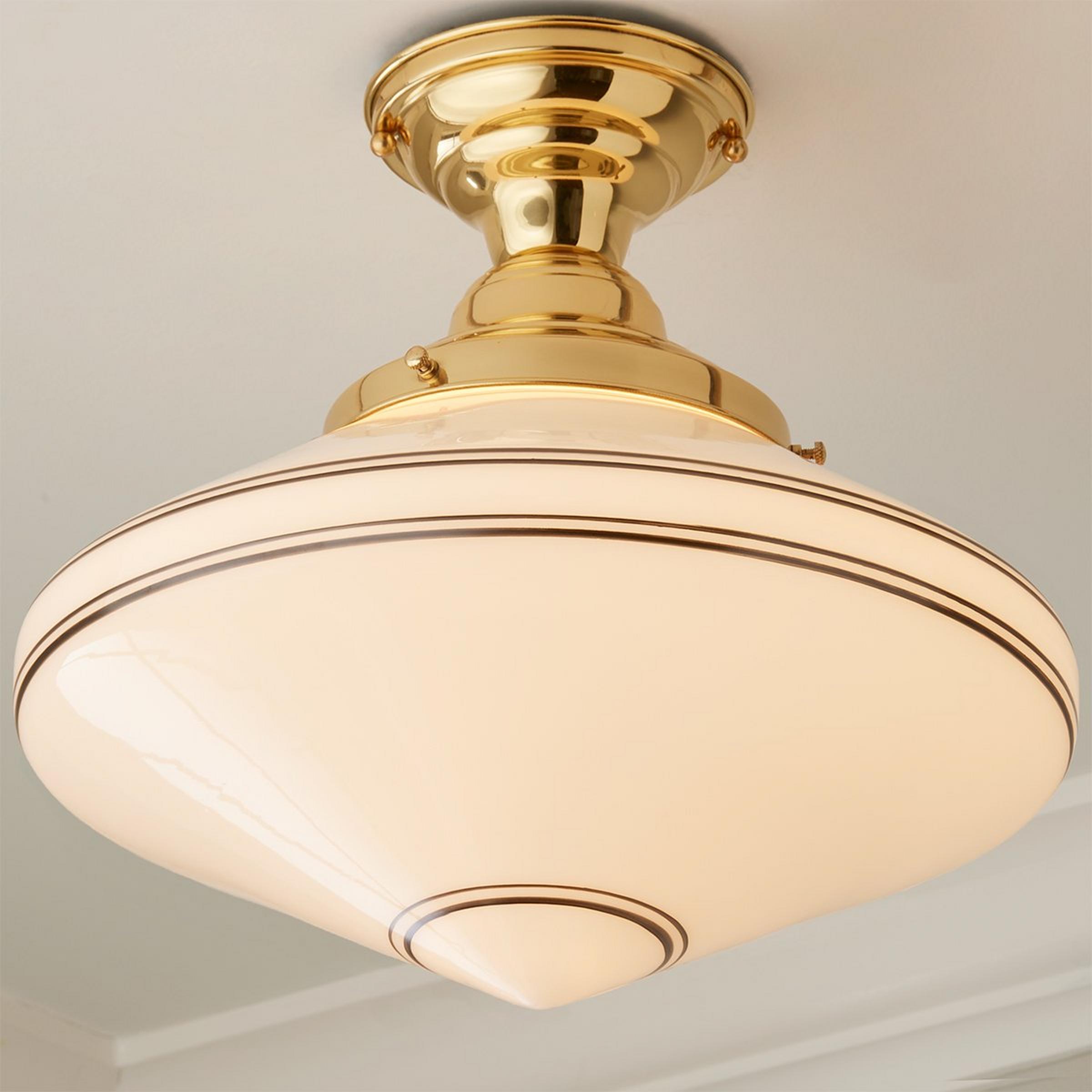 Inspired by the fittings and fixtures at a 1920's brasserie. Polished solid brass hardware blends with sculptural white opal glass punctuated by a clean black pinstripe. This ceiling light would be the perfect addition to a glamourous powder room or repeated down a hallway. This ceiling light is assembled by hand in our Richmond, Virginia production facility using solid brass hardware and glass that is made in the USA.