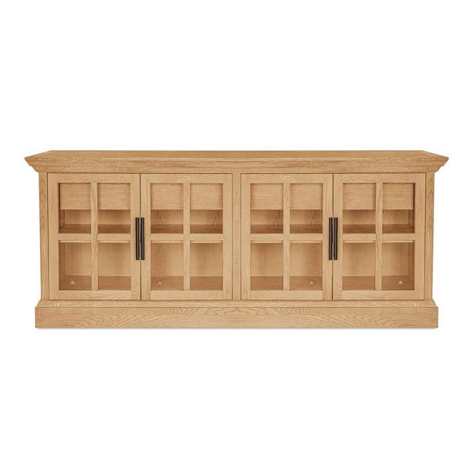 The paned glass fronts of the Tyrus sideboard give it a clean and airy feel that appeals to any style with its timeless look. Between its drawers and shelving, this console has ample storage as well as optional cord management holes. The stunning wooden structure adds a natural warmth to your space, contrasting with its rich metallic handles for a piece that stands out by complementing your space.