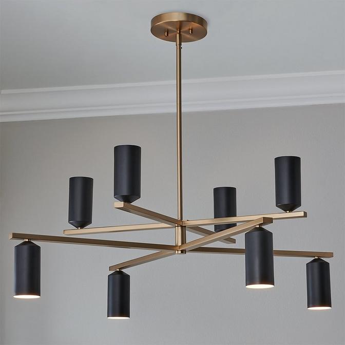 Cylindrical shades sit on the sleek lines of rotating hardware to create a functional sculpture. Ulrich is an excellent choice for high ceilings and foyers, as the metal shades project light both up and down. With layers of revolving hardware, customize your fixture to your unique space.