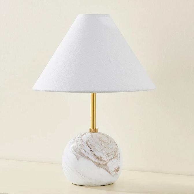 Simple and tidy, this lamp fits perfectly into smaller spaces like bedside tables. The round base showcases a brilliant marble beneath a classic, sleek shade. Due to the natural materials used, each piece will vary in veining and tone, and no two pieces will be identical.