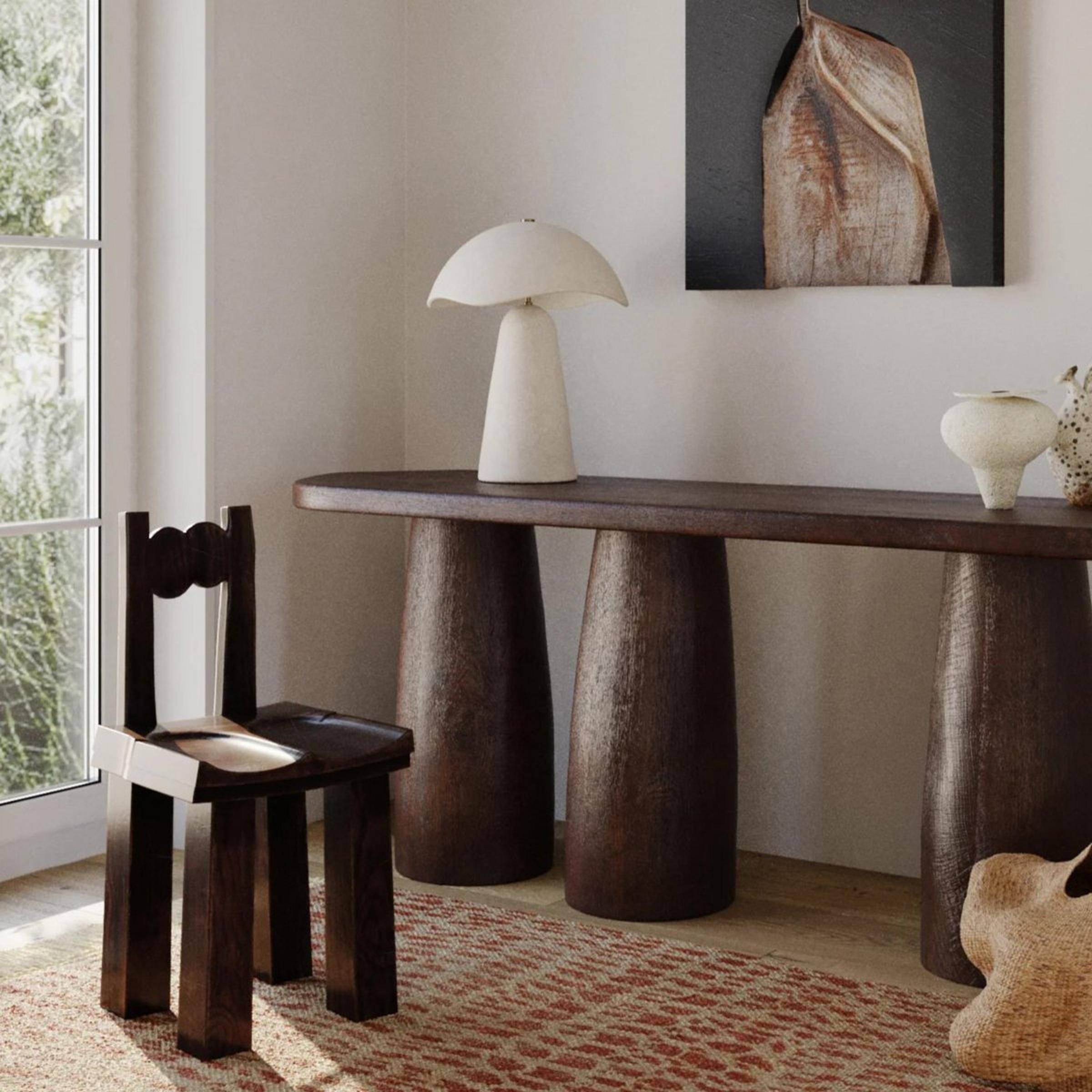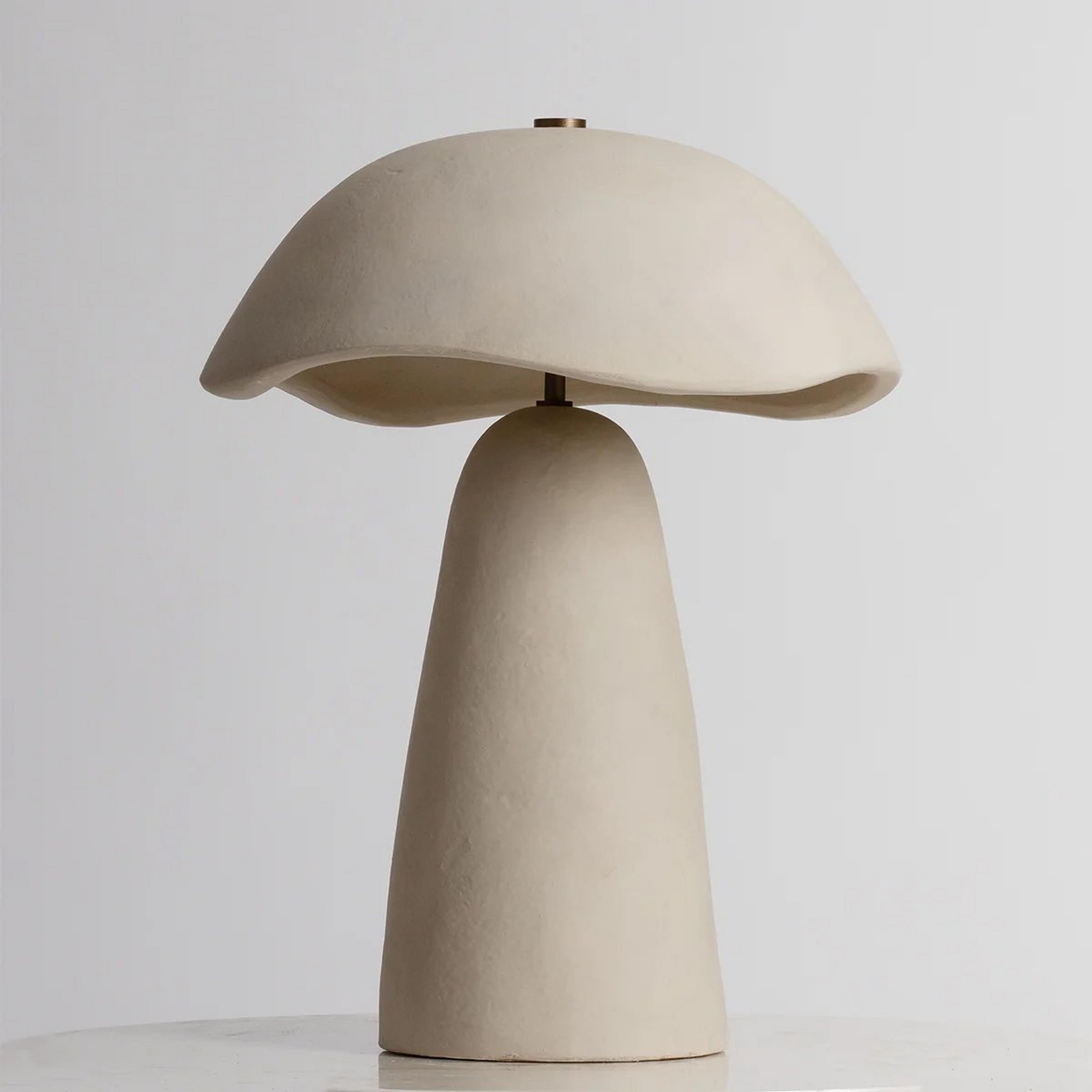 Organic, curvy edges make up the bulk of this earthy table lamp. Matching ceramic base and shade give off a cohesive feel, and offer stability through the neutral finish. When designing a room around a bold focal point, this lamp can offer support as a secondary piece that augments rather than outshines other furniture. At the same time, it is also versatile enough to be placed at the forefront of a design when needed, since it offers a calming mood through its curvature. Due to the natural materials used, each piece is unique and may vary in shape and tone.