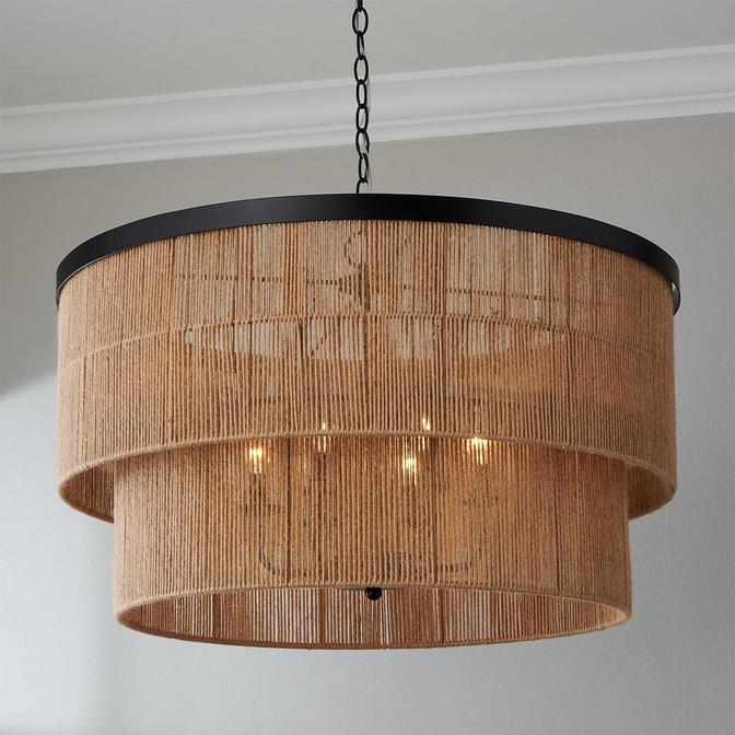 Organic abaca rope material adorns a contemporary drum silhouette for a modernized approach to boho chic lighting solutions. Feature this chandelier in a living room or bedroom for an added down-to-earth aesthetic.
