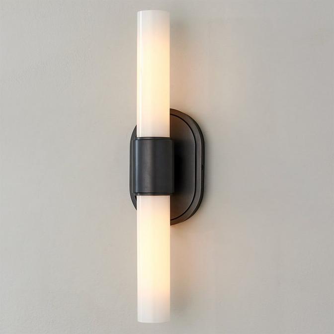 This double sconce is made from hand-blown tubular opal glass, and its minimal metal accents provide a contemporary flair. When lit, the tubes fill with light to create a soft ambient glow onto the surrounding decor for a relaxed yet visually pleasing aesthetic.