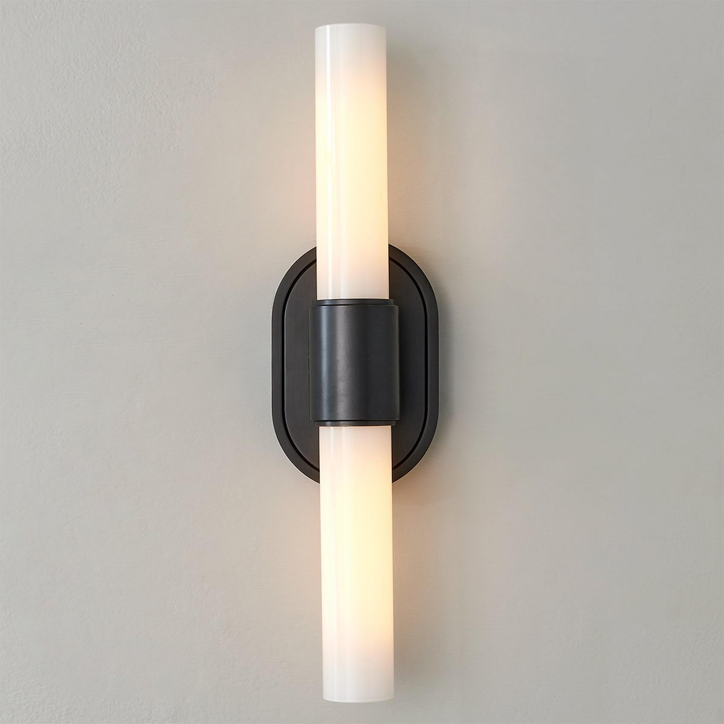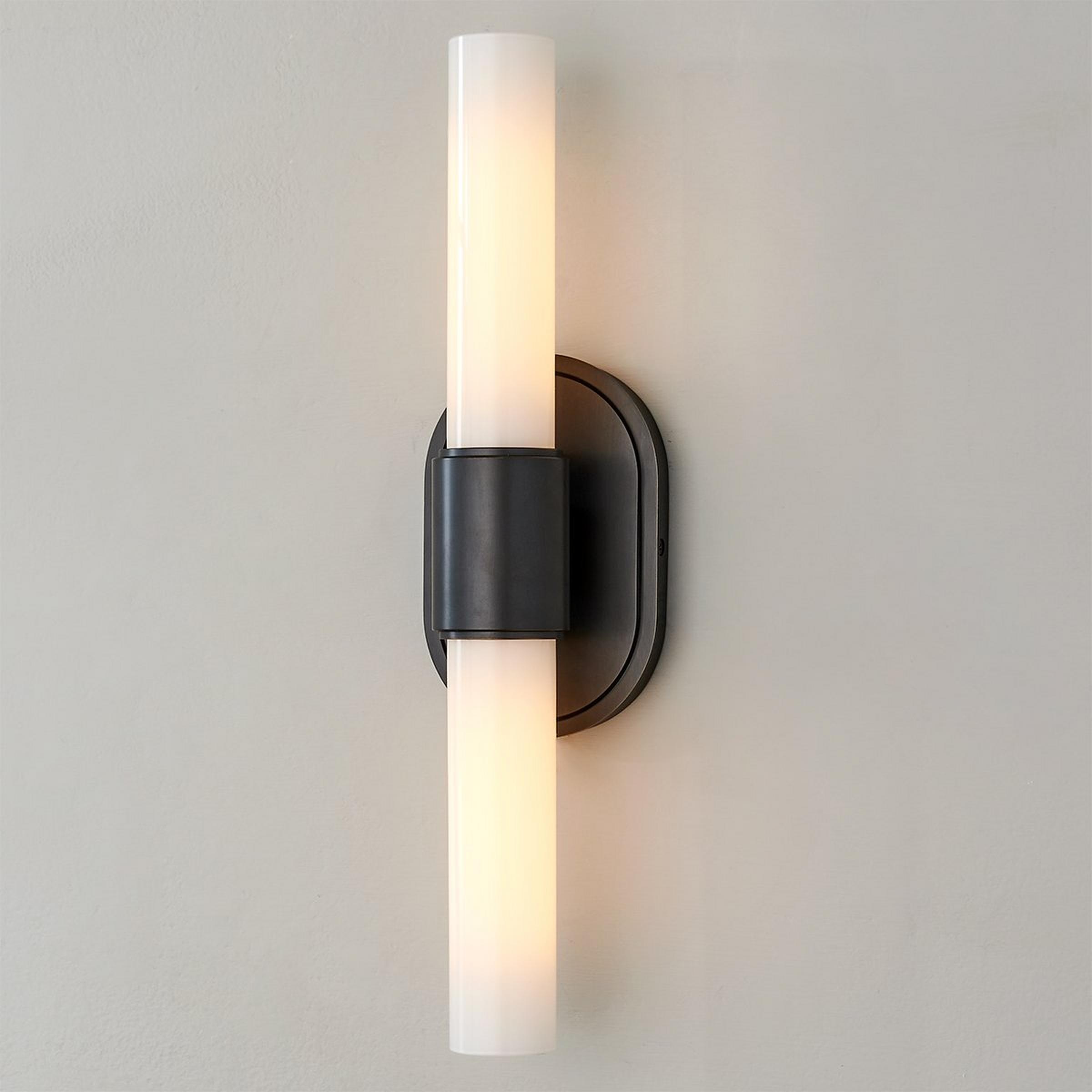 This double sconce is made from hand-blown tubular opal glass, and its minimal metal accents provide a contemporary flair. When lit, the tubes fill with light to create a soft ambient glow onto the surrounding decor for a relaxed yet visually pleasing aesthetic.