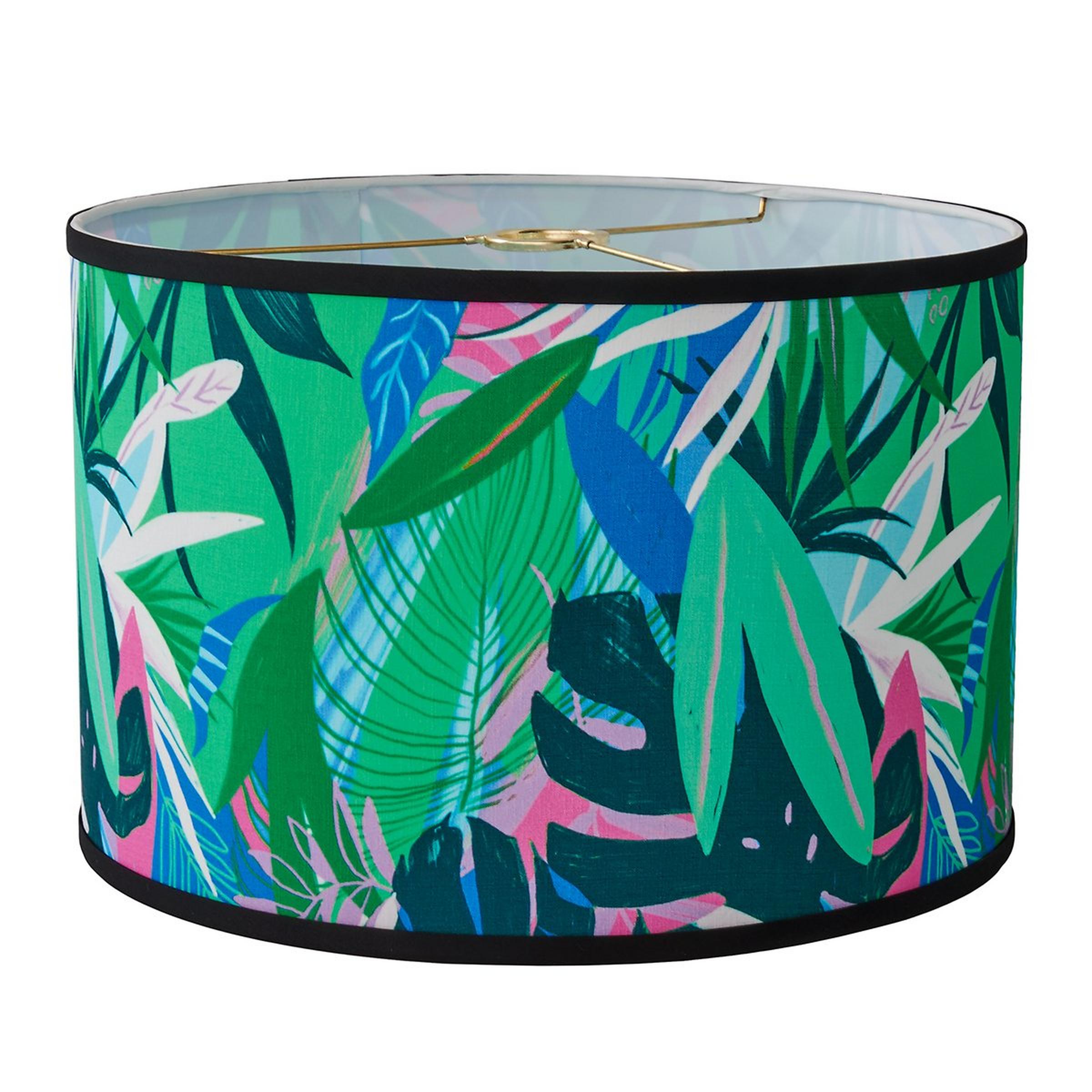 Bring a touch of the tropics into your home with our stunning Verdant Escape Drum Shade. Featuring a brass euro fitter, and silhouettes of lush green, vibrant pink, and deep navy foliage, this piece captures the essence of exotic beauty. This exclusive shade is handmade by our in-house artisans in Richmond, VA.