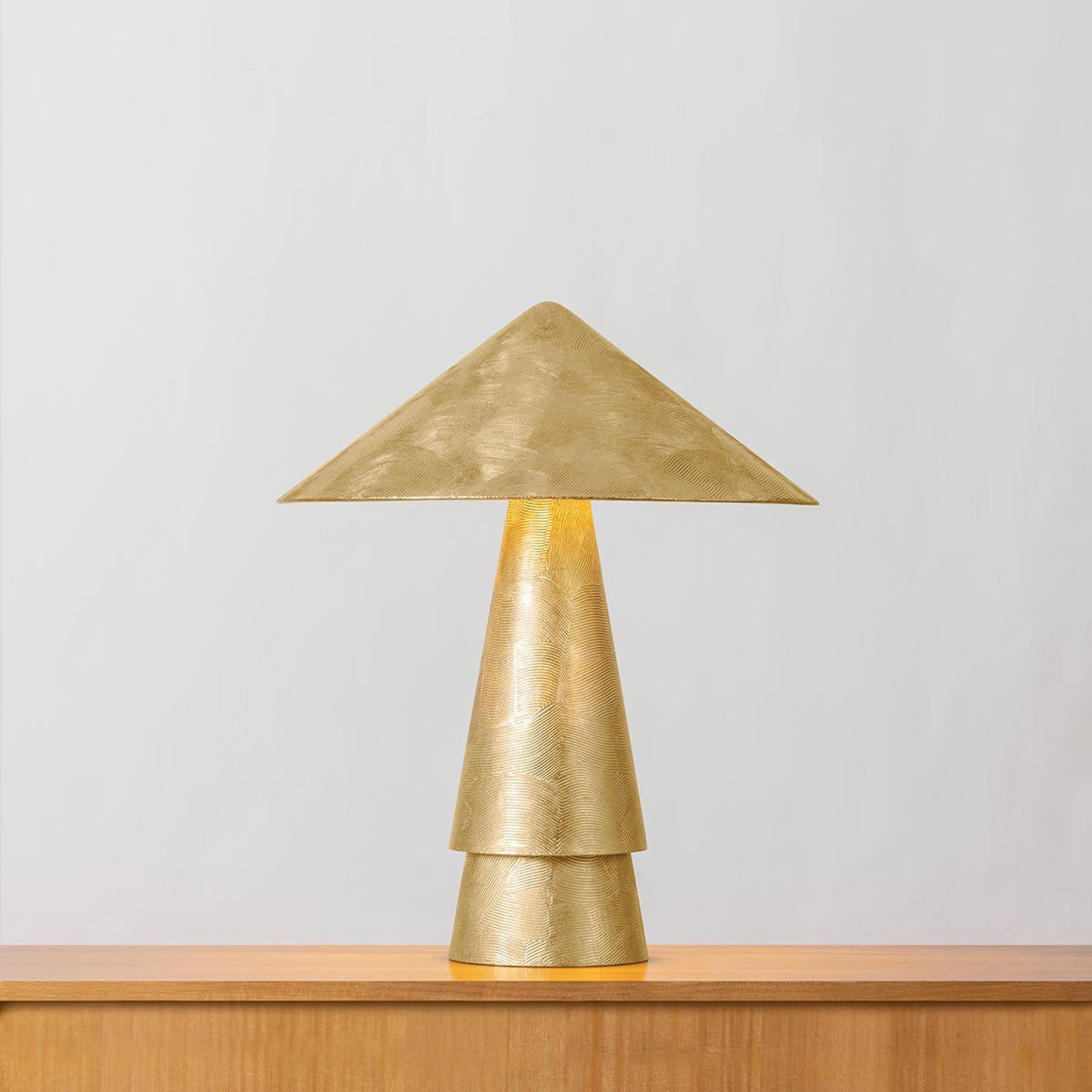 This table lamp uses a bold silhouette to aim functional downlighting over tables, sideboards, and nightstands. The delicate texture of the fixture is emphasized by the metallic shine of the surface material, and resembles feathering brush strokes, relief carvings, or windblown rock. The artistic style of this piece lends a sculptural feel to the home and complements a wide variety of design styles.