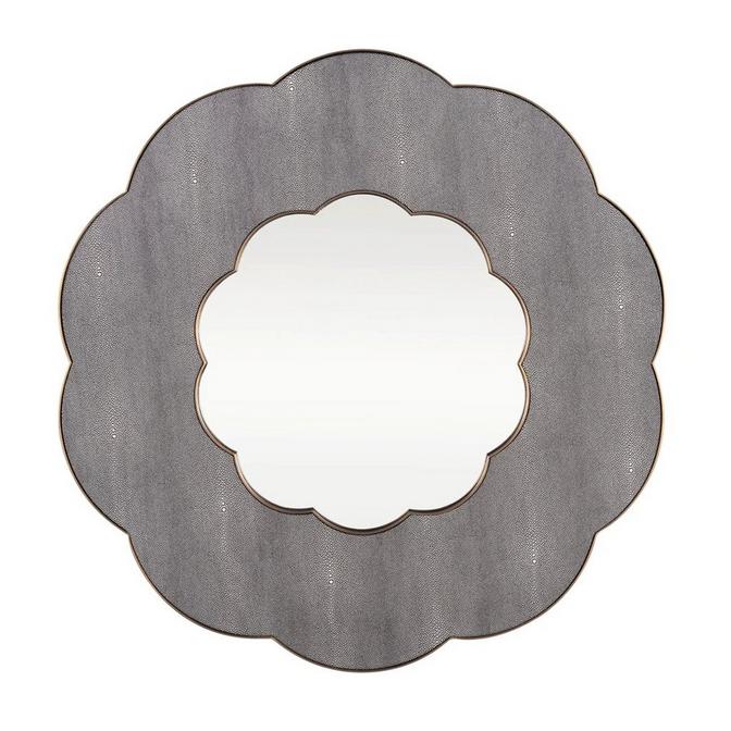Discover the mesmerizing allure of the Vieira Mirror. This stunning piece captivates the eye with its bold presence, featuring a sumptuous Gray Shagreen finish that exudes sophistication. The delicate accents of brass enhance its elegant design, making the mirror a true centerpiece that transforms any space into a realm of refined charm and style.