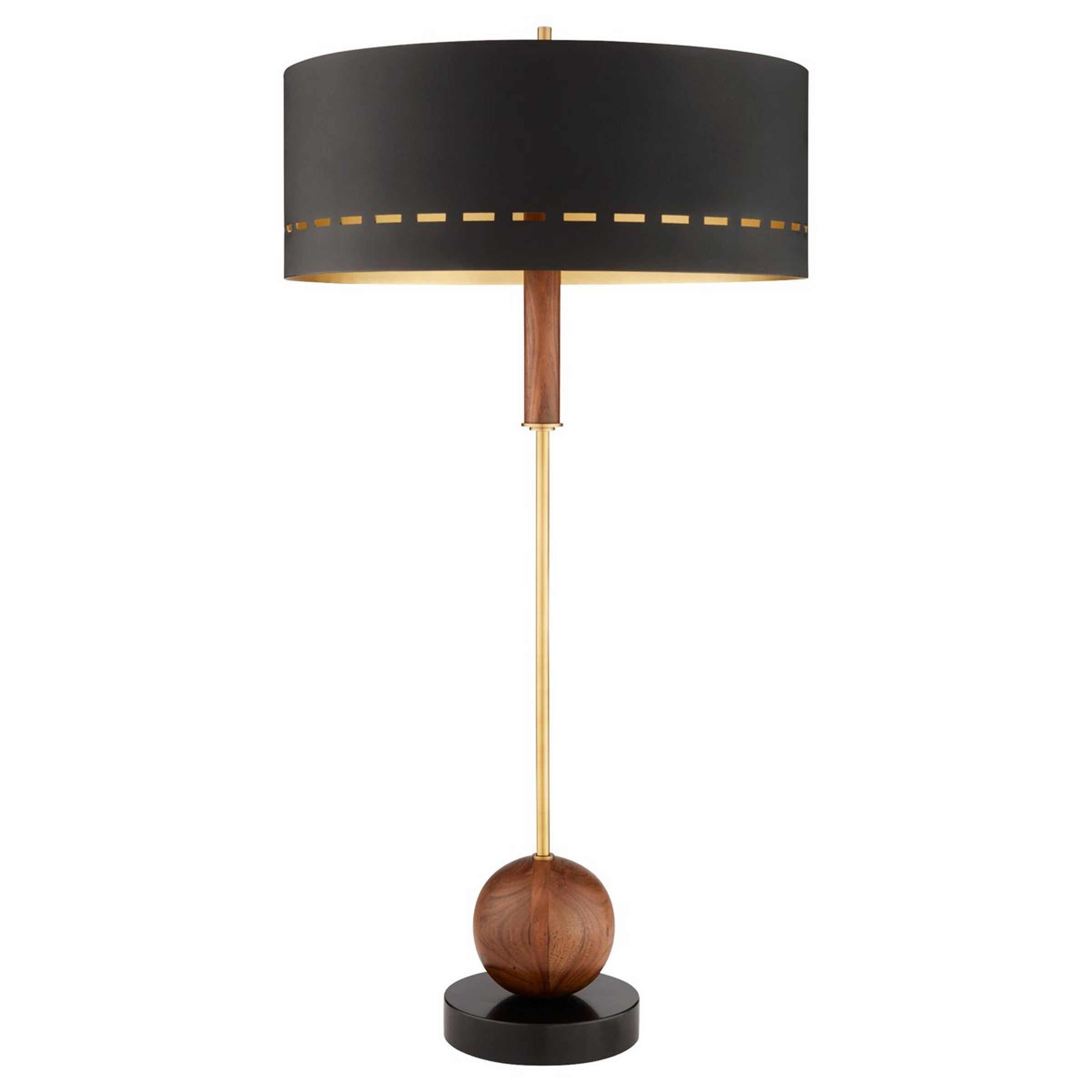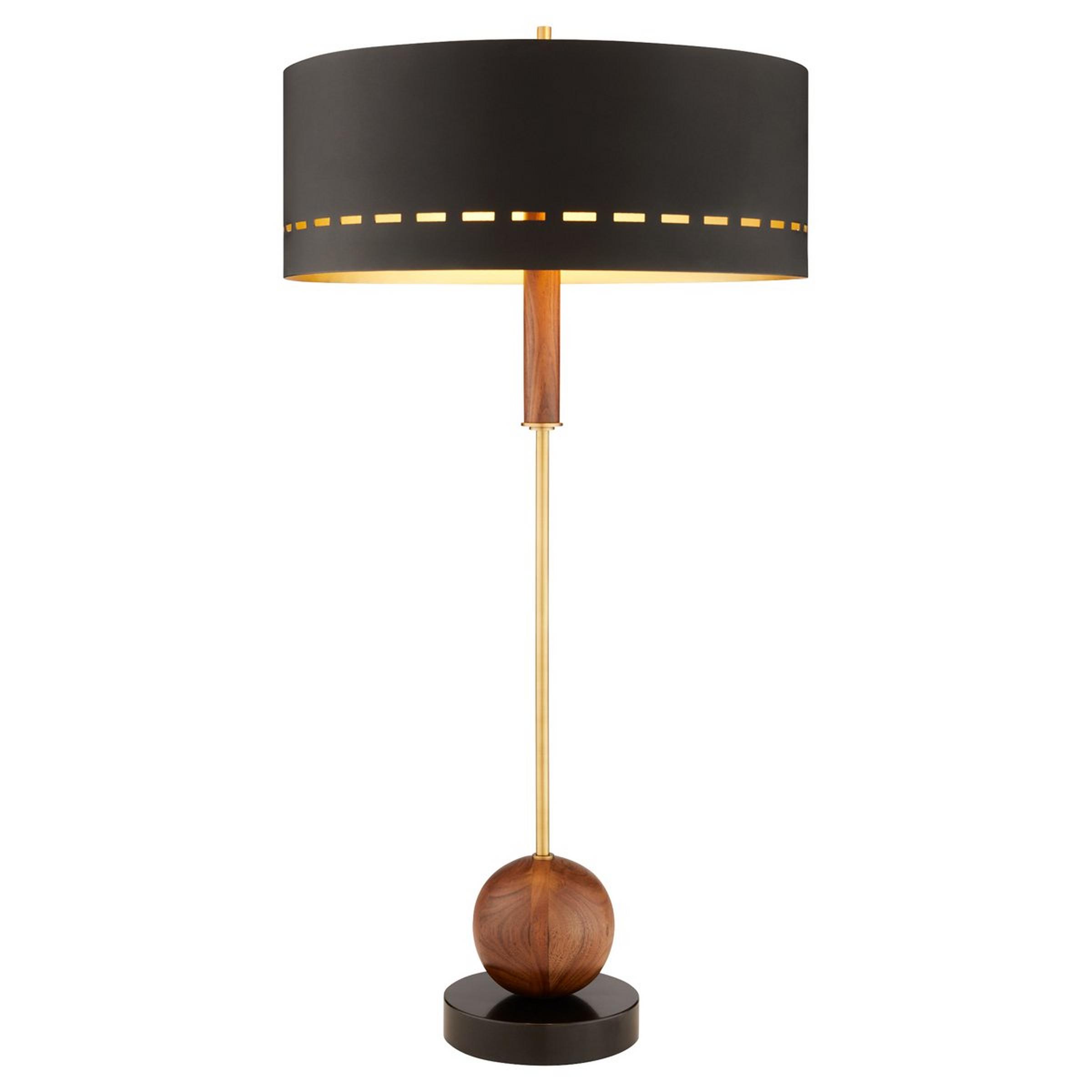 The tailored, clean lines and dramatic gilded shade of the Atelier Table Lamp are chic and distinguished. This stunning light fixture showcases a spun metal shade adorned with meticulously crafted openings that mirror intricate stitching patterns. The shade's matte exterior beautifully contrasts with the gilded interior, casting a warm and inviting glow. Enchanting metallic flourishes complement the walnut-stained acacia accents, adding a touch of warmth and natural elegance. The fixture is anchored by a solid granite base, ensuring stability and durability while contributing to its overall aesthetic appeal.