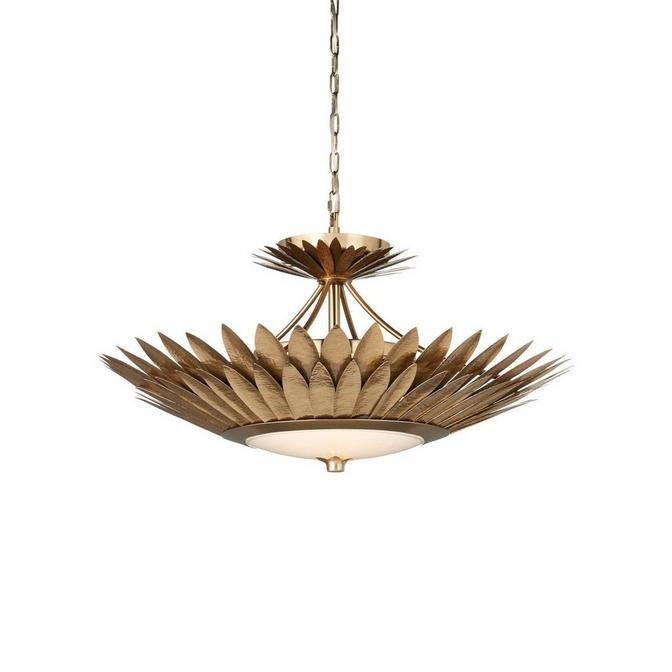 Surrounded by a radiating leaf motif, this chandelier exudes a regal air as light glows from its opal center. The hammered texture of its signature leaves adds a bold, tactile feel that plays with the shadows cast by the ambient glow. Perfect for illuminating your space, this piece easily converts to a semi-flush mount when hung without its matching chain. A timeless elevation in a classically styled living room or the ideal accompaniment to a moody dining area, this light's dramatic design is sure to enchant.