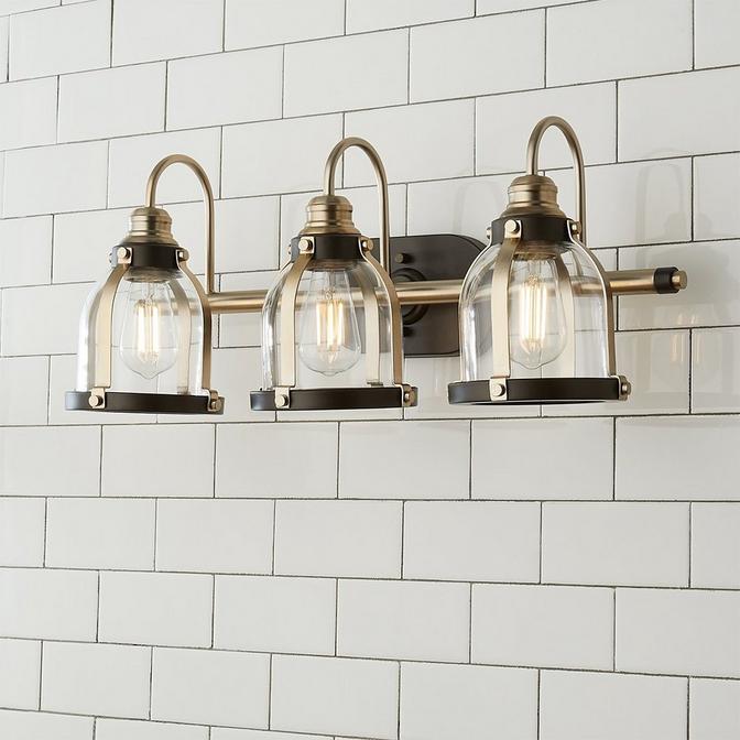 This awe-inspiring vanity light mixes sought after themes of vintage and industrial. The center shade is clear glass in a dome-like shape. For a transitional bathroom that is looking for some light, let this piece amplify your style.