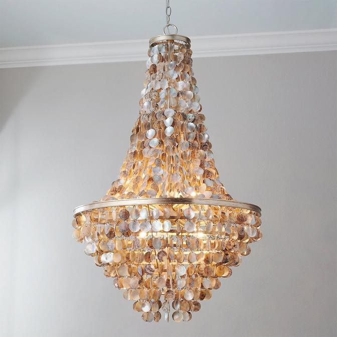 Transform your space with the enchanting allure of the Virayez Chandelier. This stunning piece features abalone shells cascading gracefully from a sophisticated frame, creating a dynamic and shimmering effect. Perfect for evoking the serene beauty of a beach getaway, this chandelier adds dimension and a hint of shine to any room. Please note this chandelier features naturally-occurring shells and variations in color, pattern, and texture should be expected and celebrated. The warm ambered silver leaf finish of this fixture may appear more silver or more gold depending on the room decor and lighting in which it is viewed.