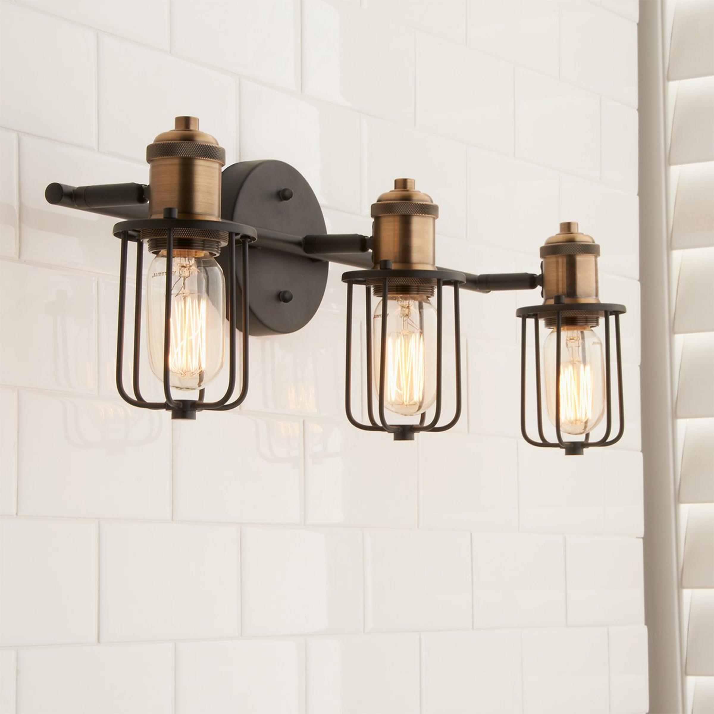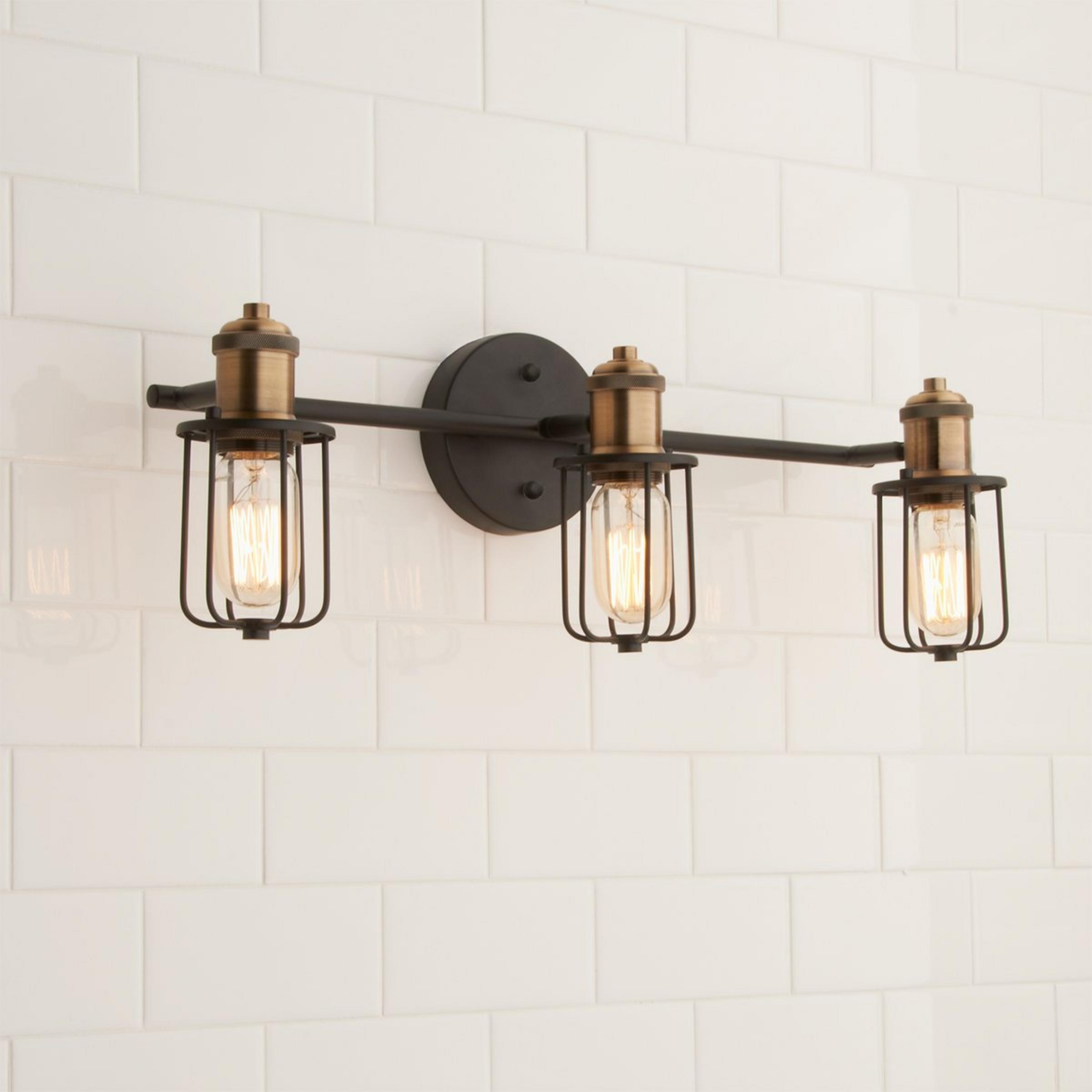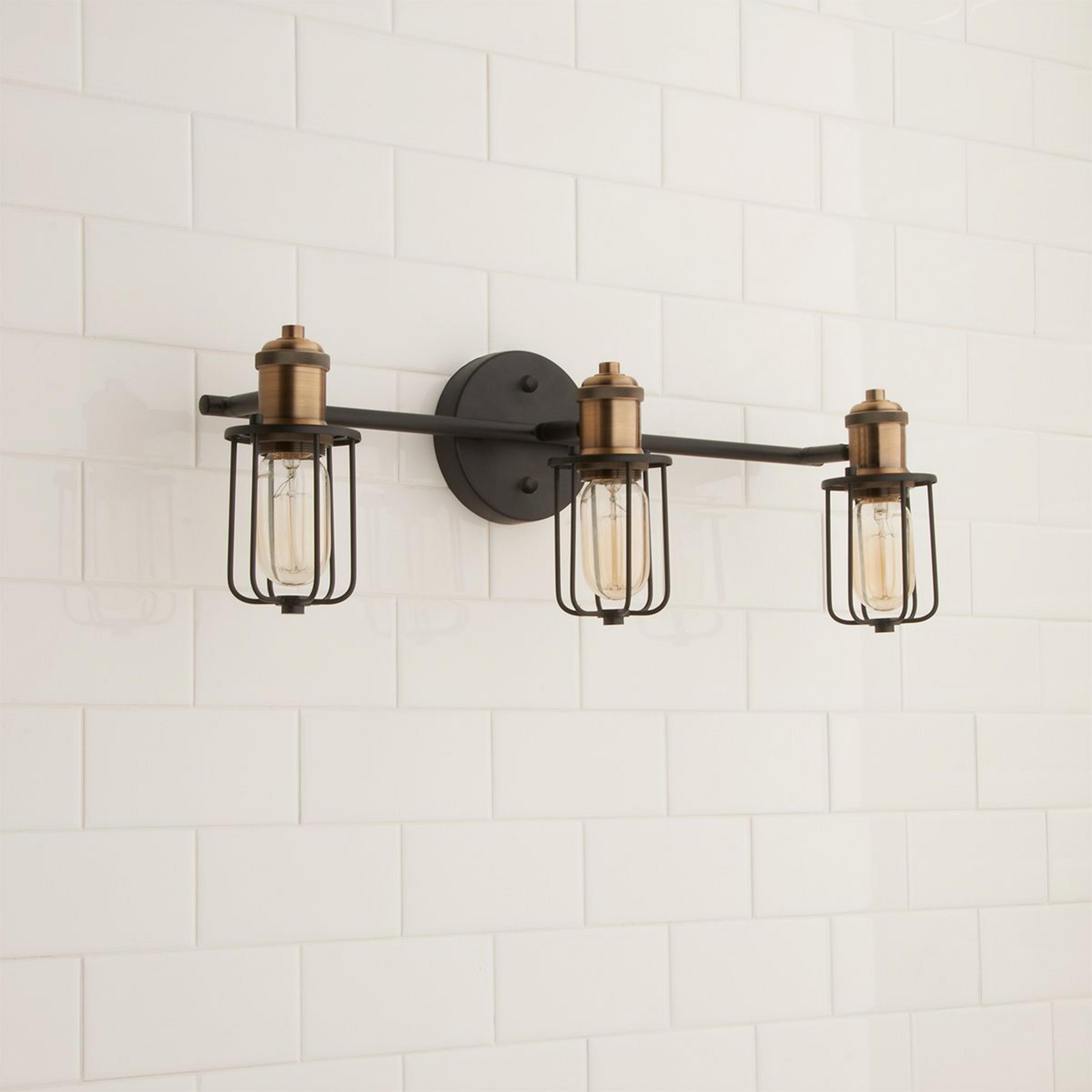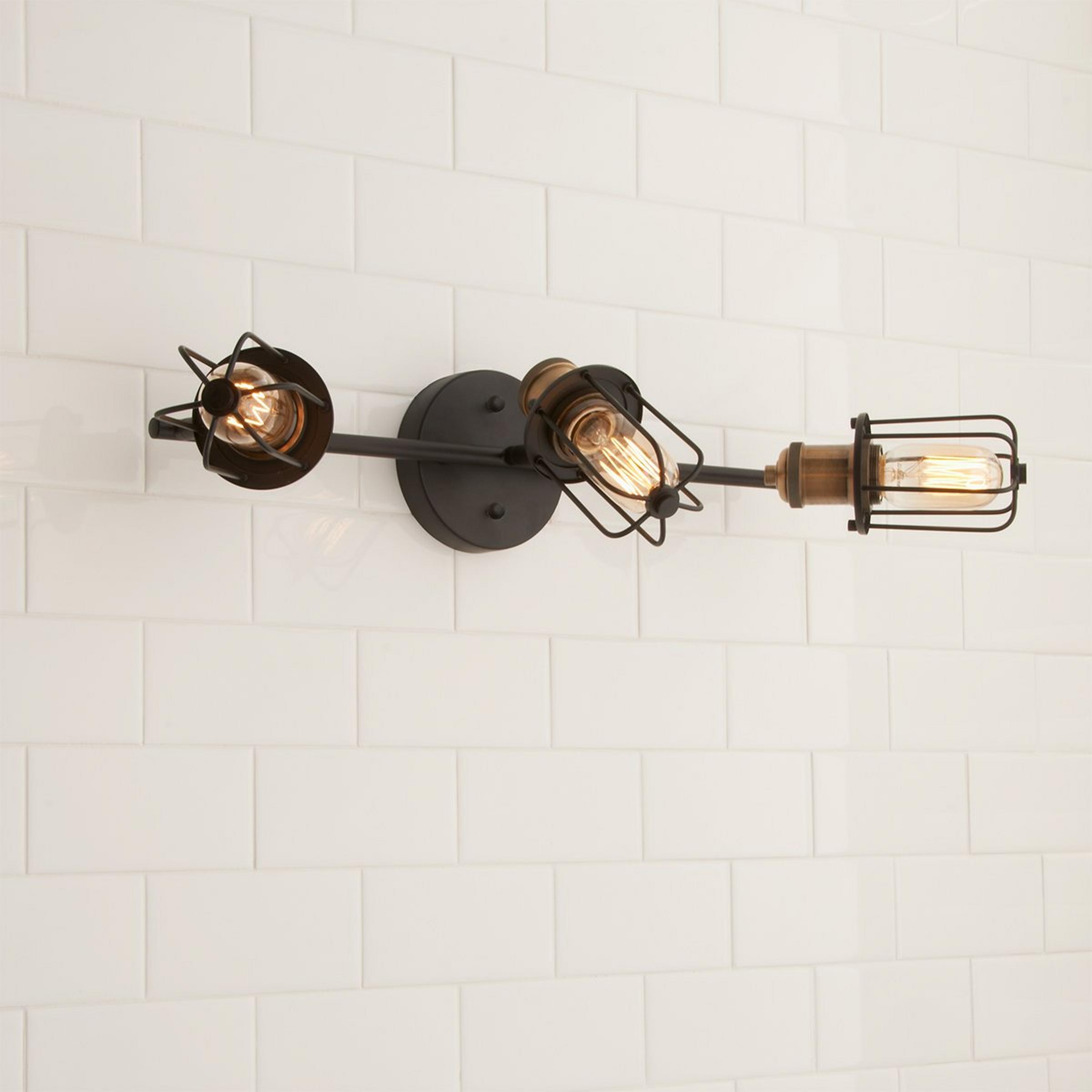 This bold industrial look has lots of style with warehouse-inspired cage shades in Matte Black and flashy Gold sockets. The effect is elevated by the 360 degree adjustability of the lamps. 7.5"H x 22"W x 6.5"D is based on "standard" vanity light configuration. Can be wall or ceiling mounted. 9" max. height when ceiling mounted. DUE TO THE CAGE SIZE WE RECOMMEND USING A TUBE BULB SUCH AS BU23021.