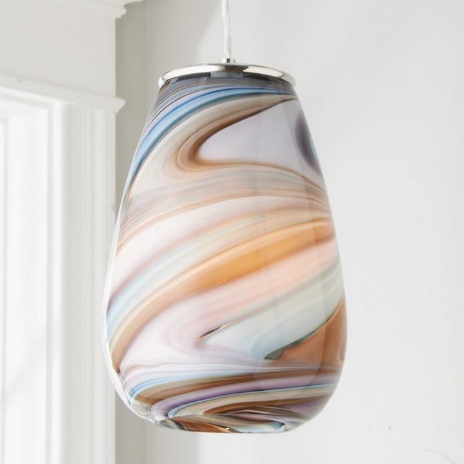 Swirling multicolor hand blown glass creates an effect reminiscent of an aurora borealis, making this unique art glass pendant an impressive accent in any space. Due to the nature of this art glass piece no two will be exactly alike in color, pattern, or shape.