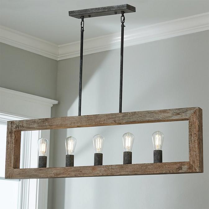 The Waylon Island Chandelier is one that speaks volumes for rustic minimalists. This simple fixture features a wooden frame that holds five center lights, perfect for a dining room accessory or above your kitchen island.
