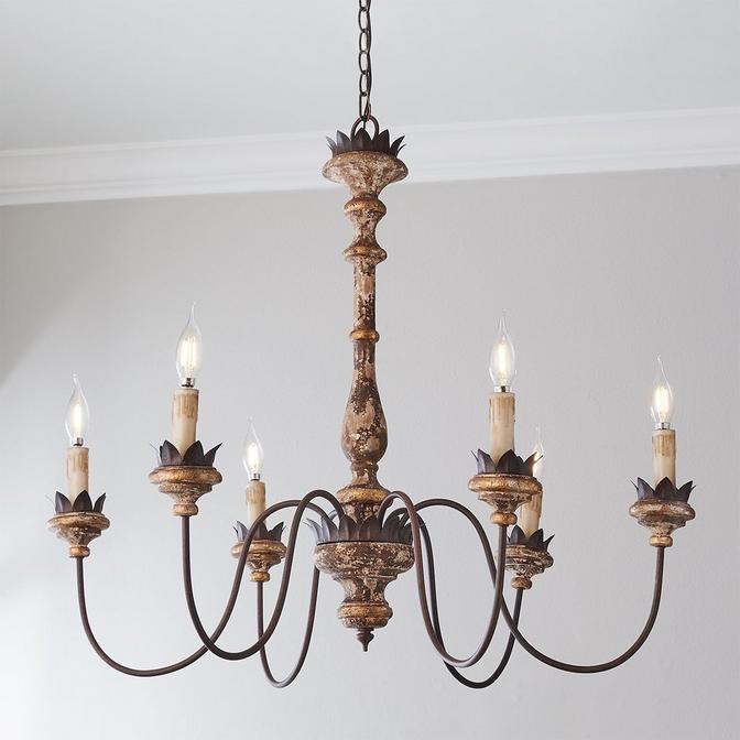 Long curving arms radiate from a spindle-shaped wood body with leaf-shaped metal accents and dripping candle covers to create a flowing vintage-look chandelier. The weathered sepia finish features highlights of gold and undertones of black that pair with the rusted iron accents to add drama and character to a foyer, living room, dining room or bedroom!