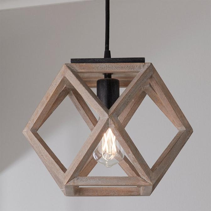 This weathered wood geometric pendant light exudes laid-back modern style. Lightweight wood with a gray wash finish reminiscent of driftwood will brighten your space and blend right in with your coastal, lodge or eclectic home. Character defining variation in the finish is to be expected with this natural wood piece.