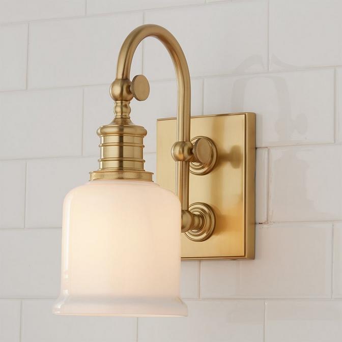 A gooseneck pivoting arm in solid cast brass, a white opal glass tumbler shade, precision restoration fittings, and exquisite finishes make this collection a clear winner.