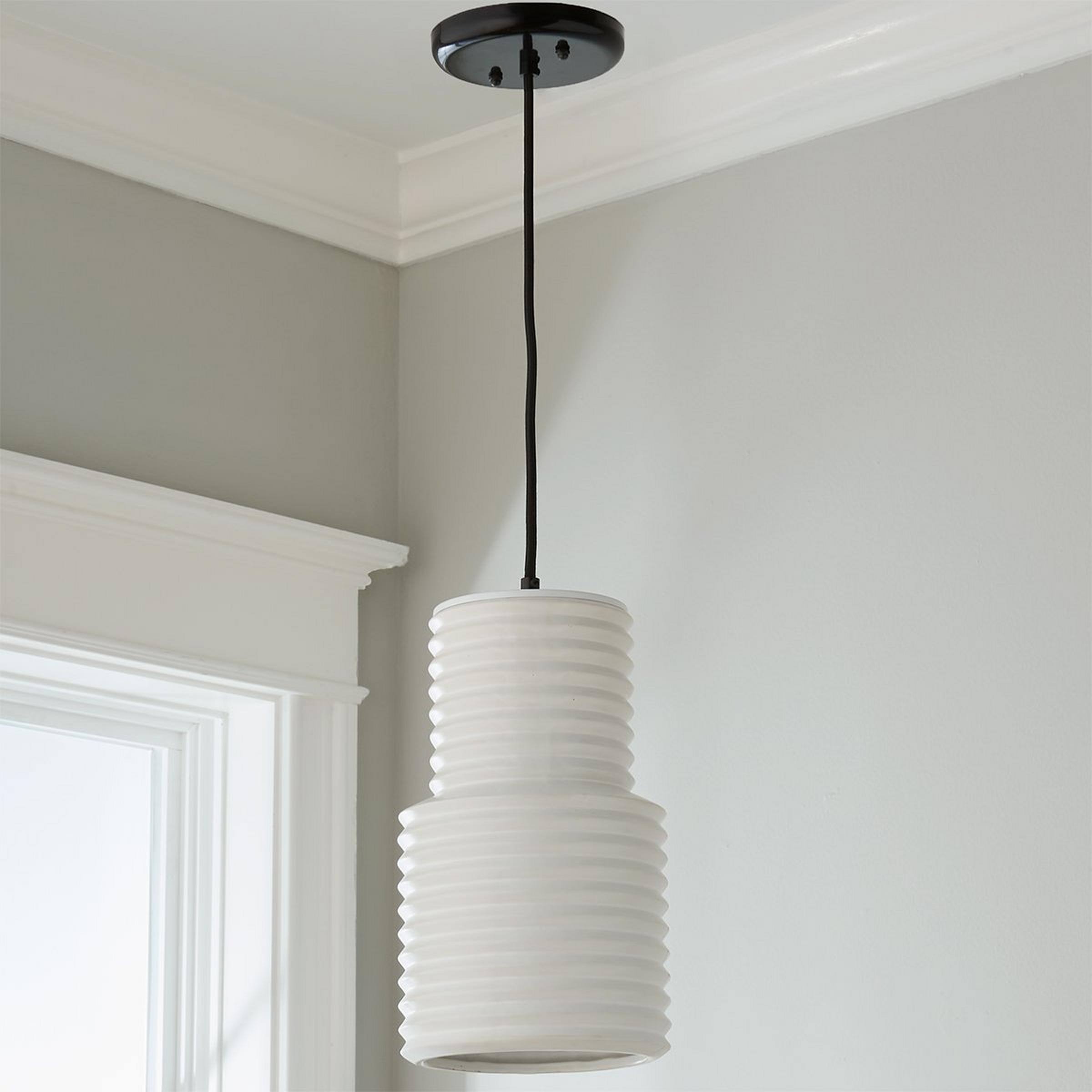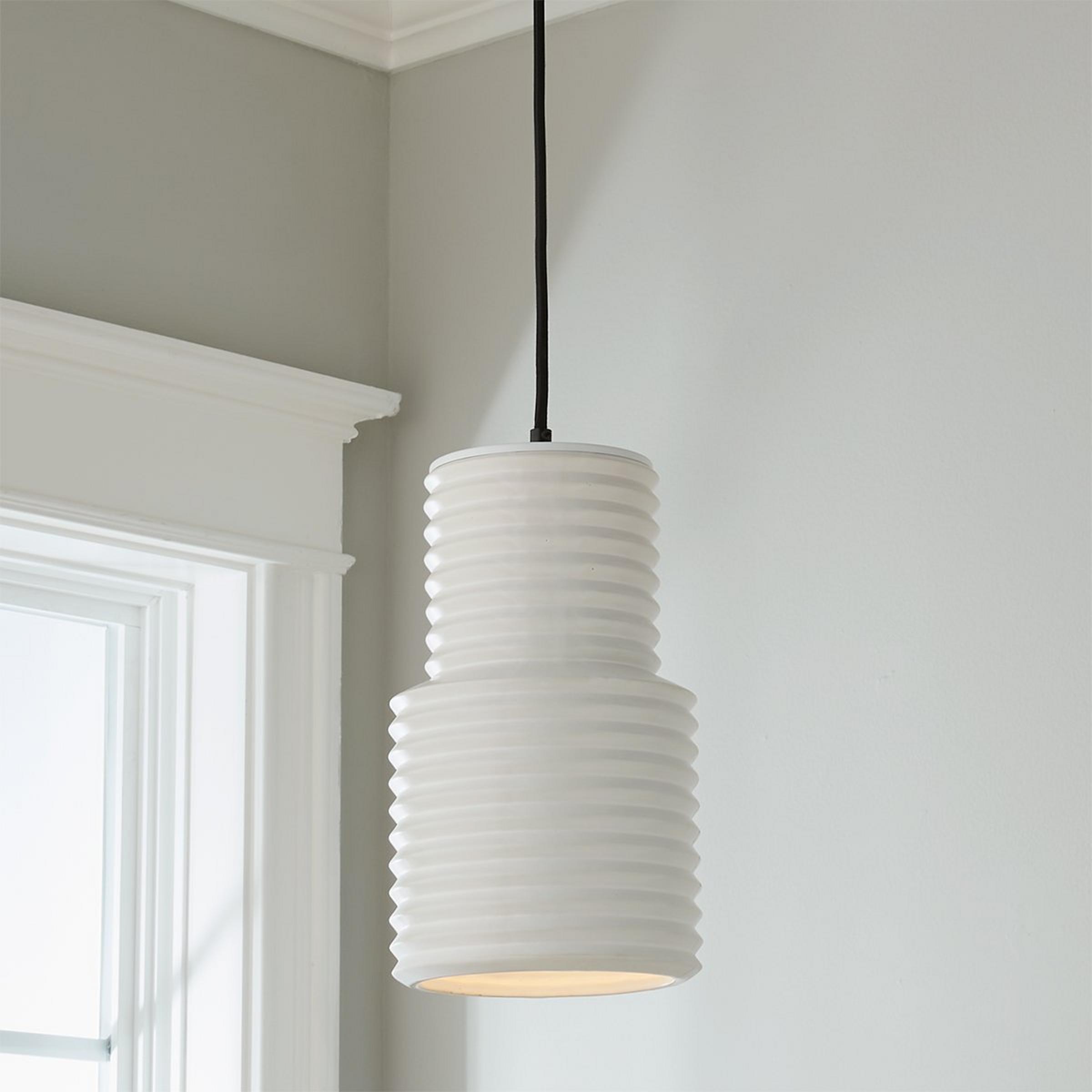 White ceramic shaped into a crisp accordion fold shape is accented with black hardware. Creating a striking contrast on this clean, contemporary pendant. This pendant is assembled by hand in our Richmond, Virginia production facility.