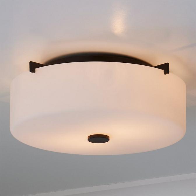 A modern white opal glass drum shade is punctuated with square brackets for cosmopolitan style in this low profile ceiling fixture.