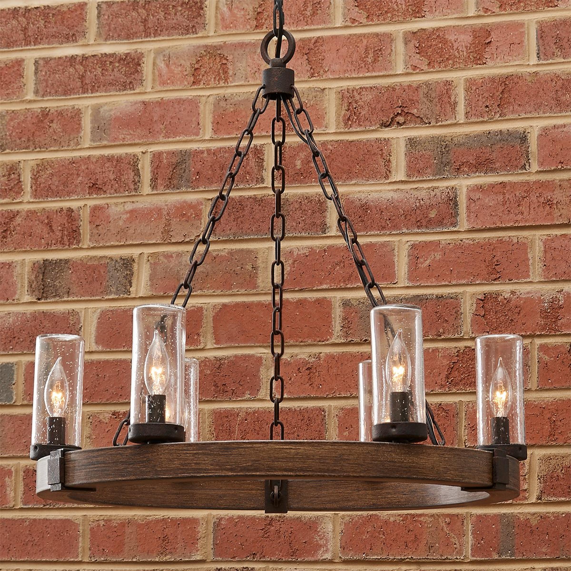 This gorgeous rustic fixture is perfect for dressing up trendy outdoor spaces. The rich finish over coated steel is as resilient as it is stylish, and dark, bolted metal accents form a beautiful contrast against the lighter body and clear seeded glass.