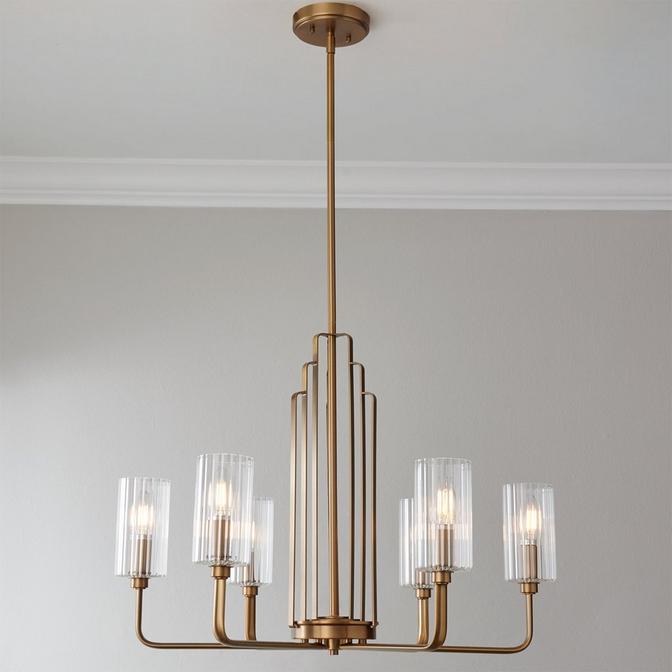 Wunderly is a luxury lighting family that embodies the glamour of Deco design by dramatically combining modern and vintage details. Featuring geometric arches and clear fluted glass, this stunning chandelier will stand out in any setting!