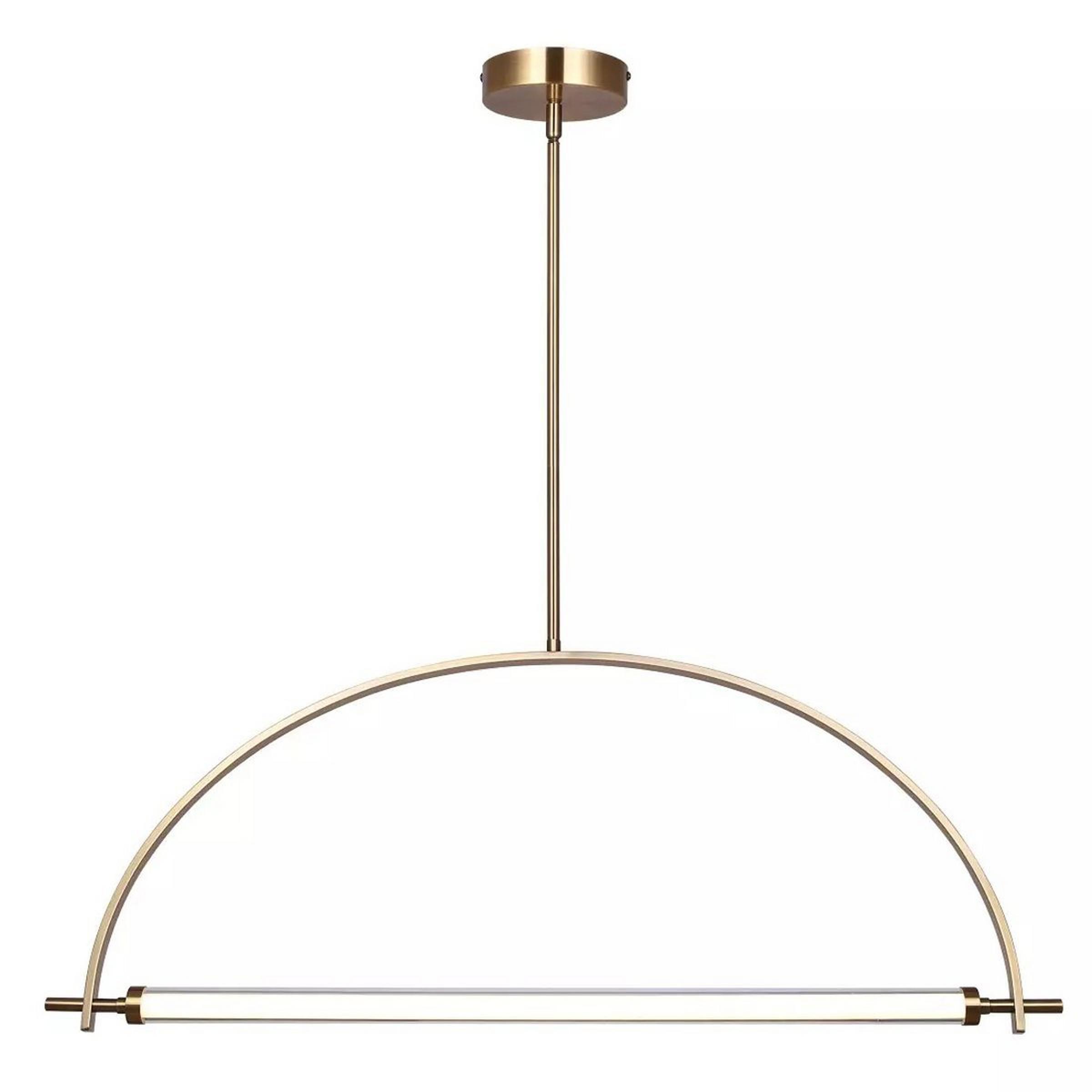 This linear chandelier shines a warm glow above kitchen islands and dining tables from an elegantly thin framework. The beautiful bar of light is suspended by a wonderfully arcing support rod, providing a light and airy mood.
