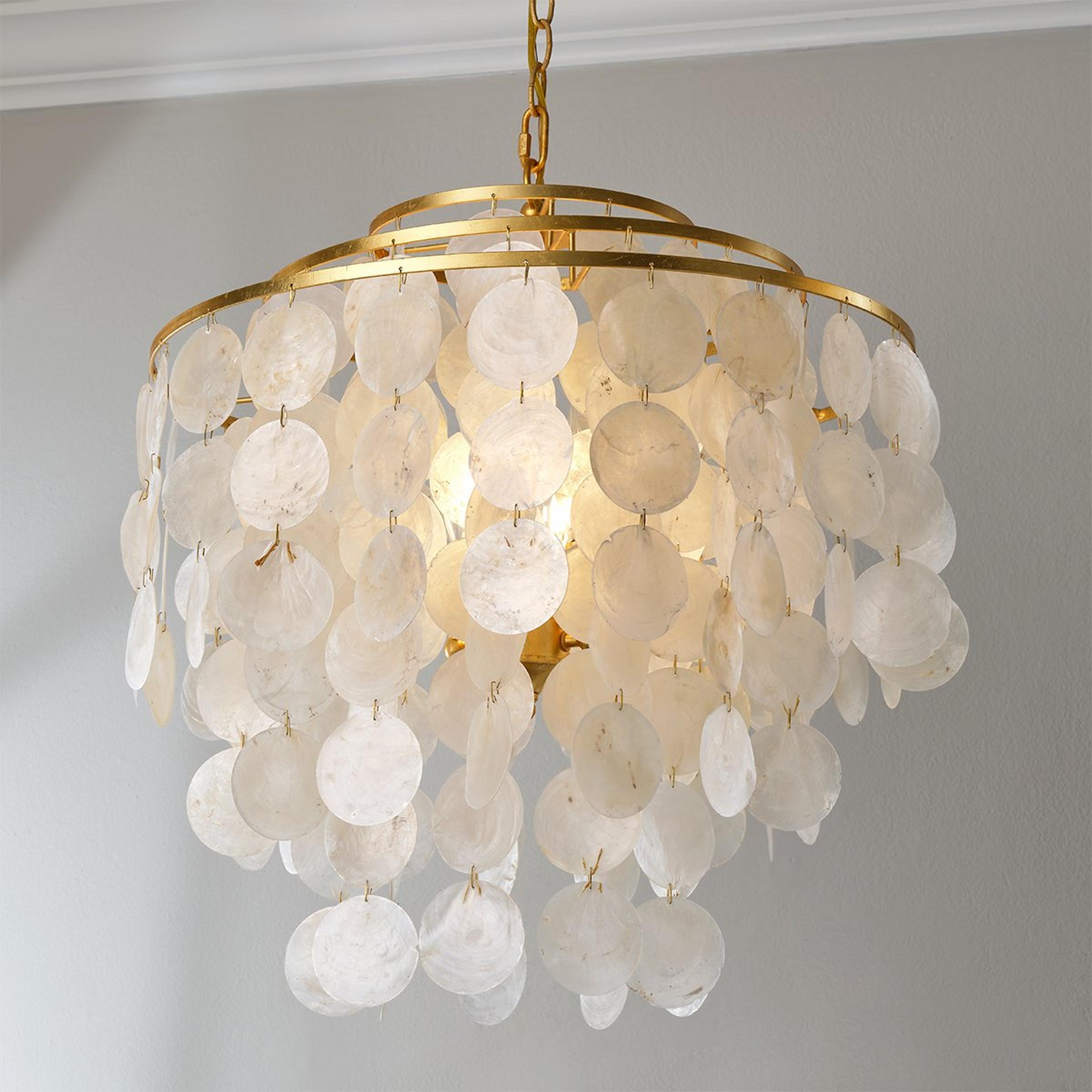 Designed by bloggers Sherry and John Petersik of Young House Love, this graceful circular chandelier has three layers of iridescent white capiz shell cascading down a Polished Nickel or Gold Leaf frame. What makes this capiz shell chandelier delightfully different from all the rest are the almost 3" diameter capiz discs making them a unique stand-out. Hang from a couple of chains for a stunning semi-flush ceiling light in a foyer, hallway or bedroom. 2.9" capiz shell diameter.
