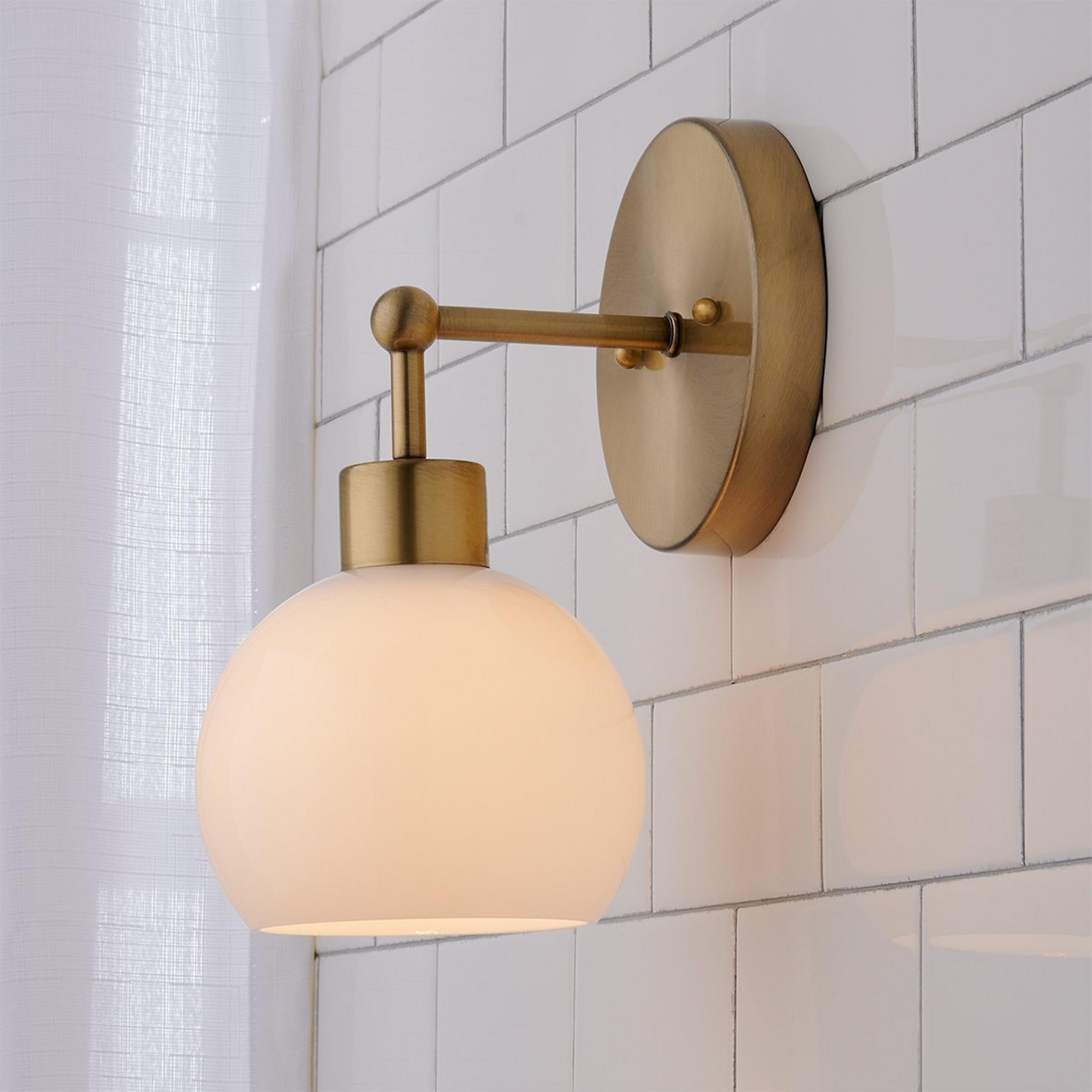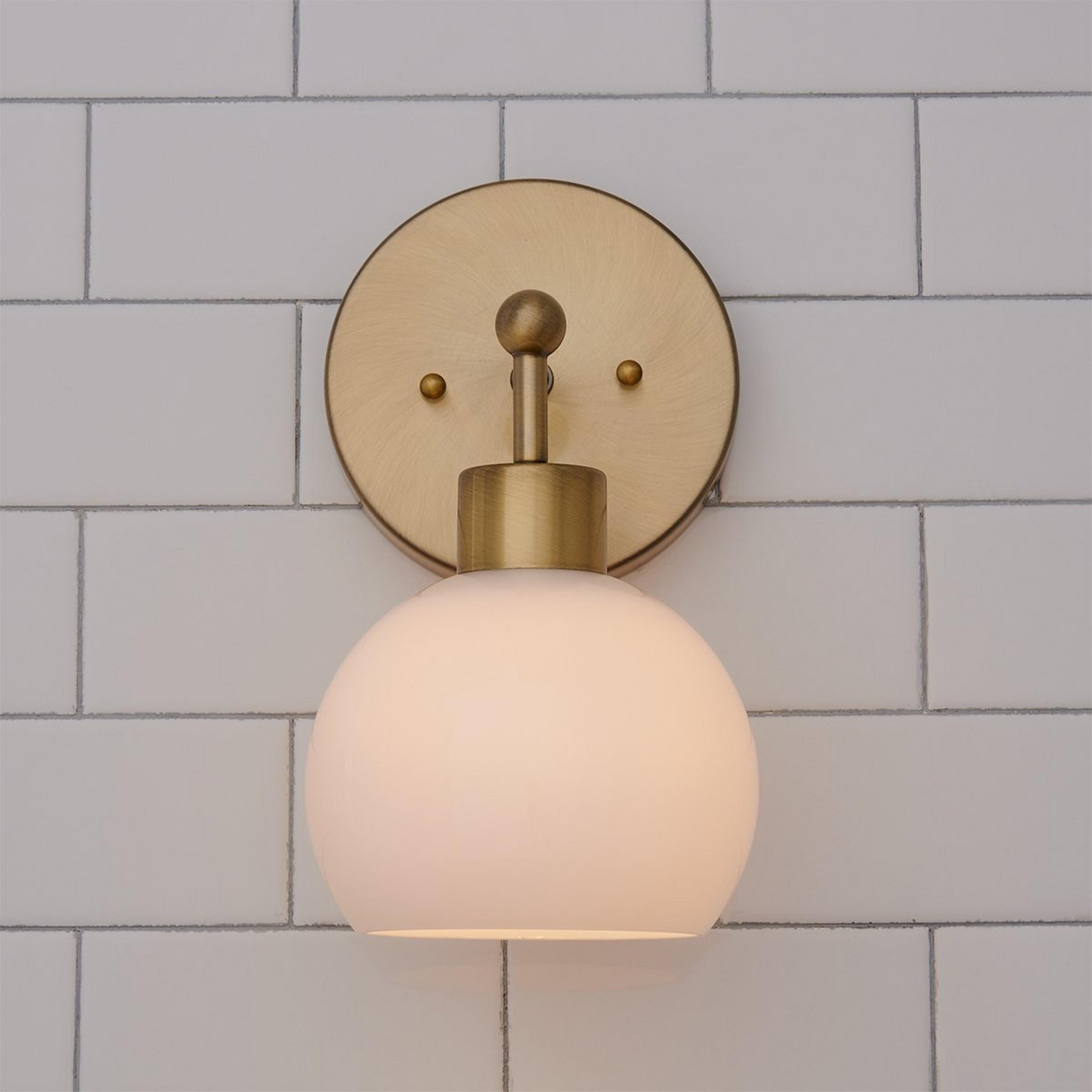 This Young House Love 1-Light Glass Bubble Bath Sconce is a new addition to one of our most popular YHL products! Its open glass globe, available in several sleek colors and finishes, makes it a stylish mid-century modern bubble bath sconce choice. We recommend updating a boring bathroom by removing outdated builder light fixtures and mounting this fun vanity light above an existing cabinet.