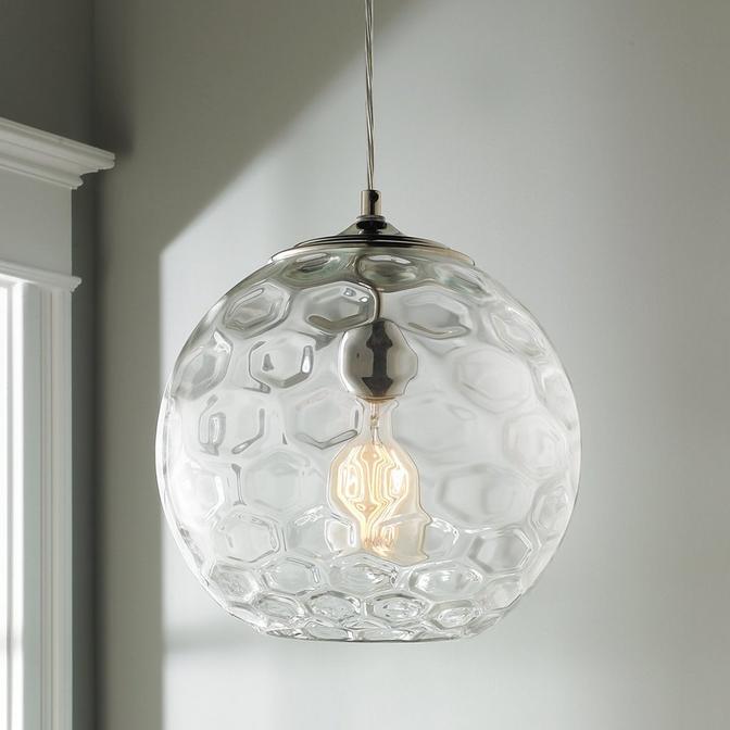 This handmade Young House Love exclusive features an organic honeycomb pattern they love. Use this clear glass pendant above a kitchen sink or group several above an island for a bright clean style.