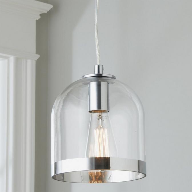 This Young House Love clear glass dome pendant is rimmed in Chrome for a unique take on the clear and chrome pendant. Perfect over a kitchen island, this pendant is able to fit in with any decor.