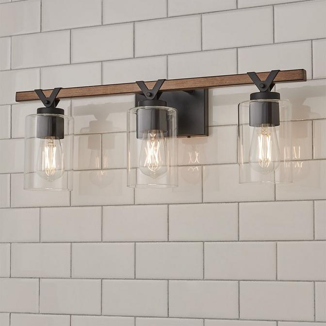 Elevate your powder room with this farmhouse-inspired vanity light. Clear cylindrical glass shades allow the wooden accents to make a noticeable statement, and the versatile style is enough to complement a wide range of decor.