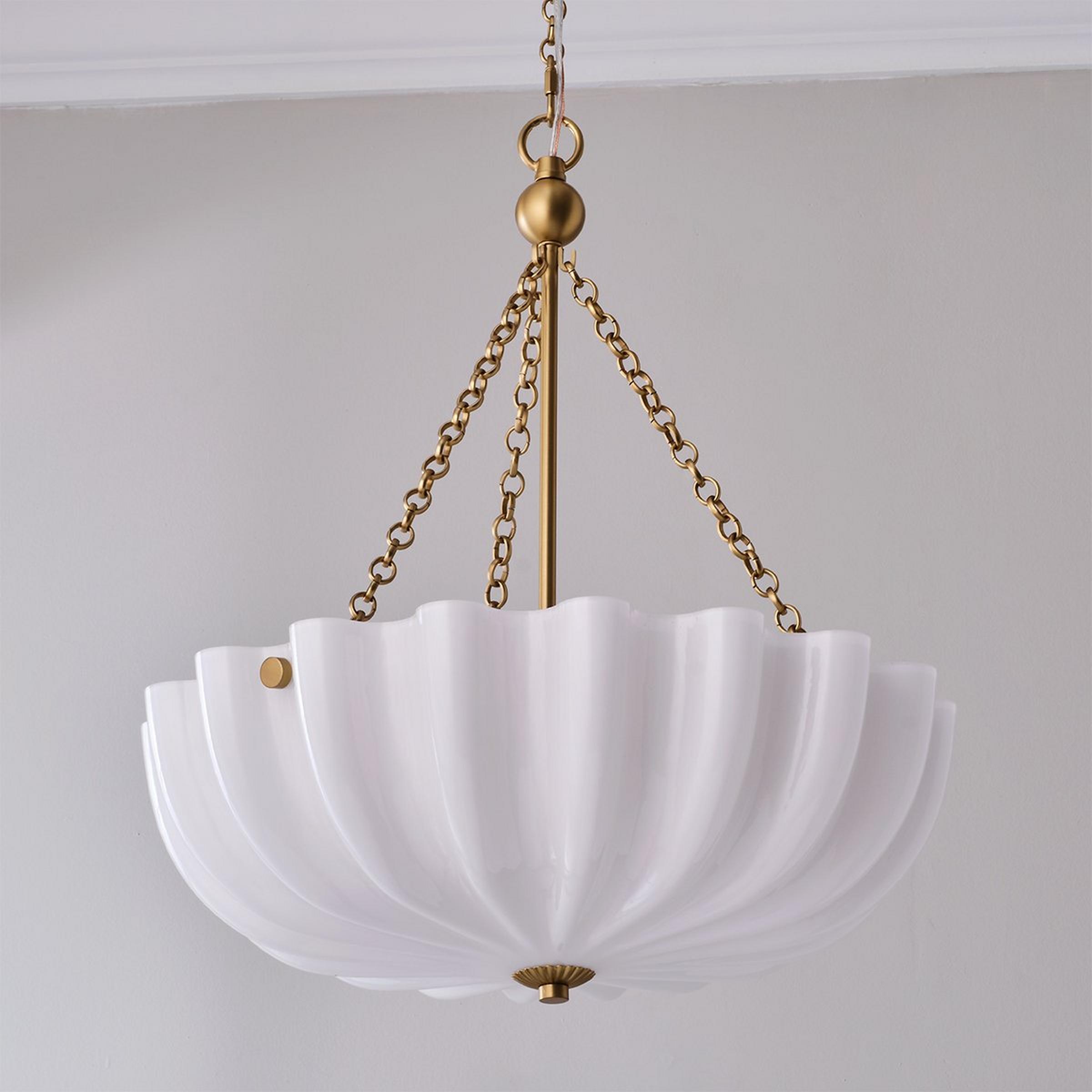 Zenaida's opal glass shade is captivating and unique. This chandelier's gentle curves and ornate backplate reflect vintage styles with lasting elegance. Underneath the stunning shade, an acrylic cover keeps your light protected from dust without interfering with its design. Pair without the extended decorative chain and style as a dramatic low-hanging ceiling light perfect for dining rooms and living areas. Its warm glow beautifully illuminates your space and complements various design styles. and living areas. Its warm glow beautifully illuminates your space and complements various design styles.