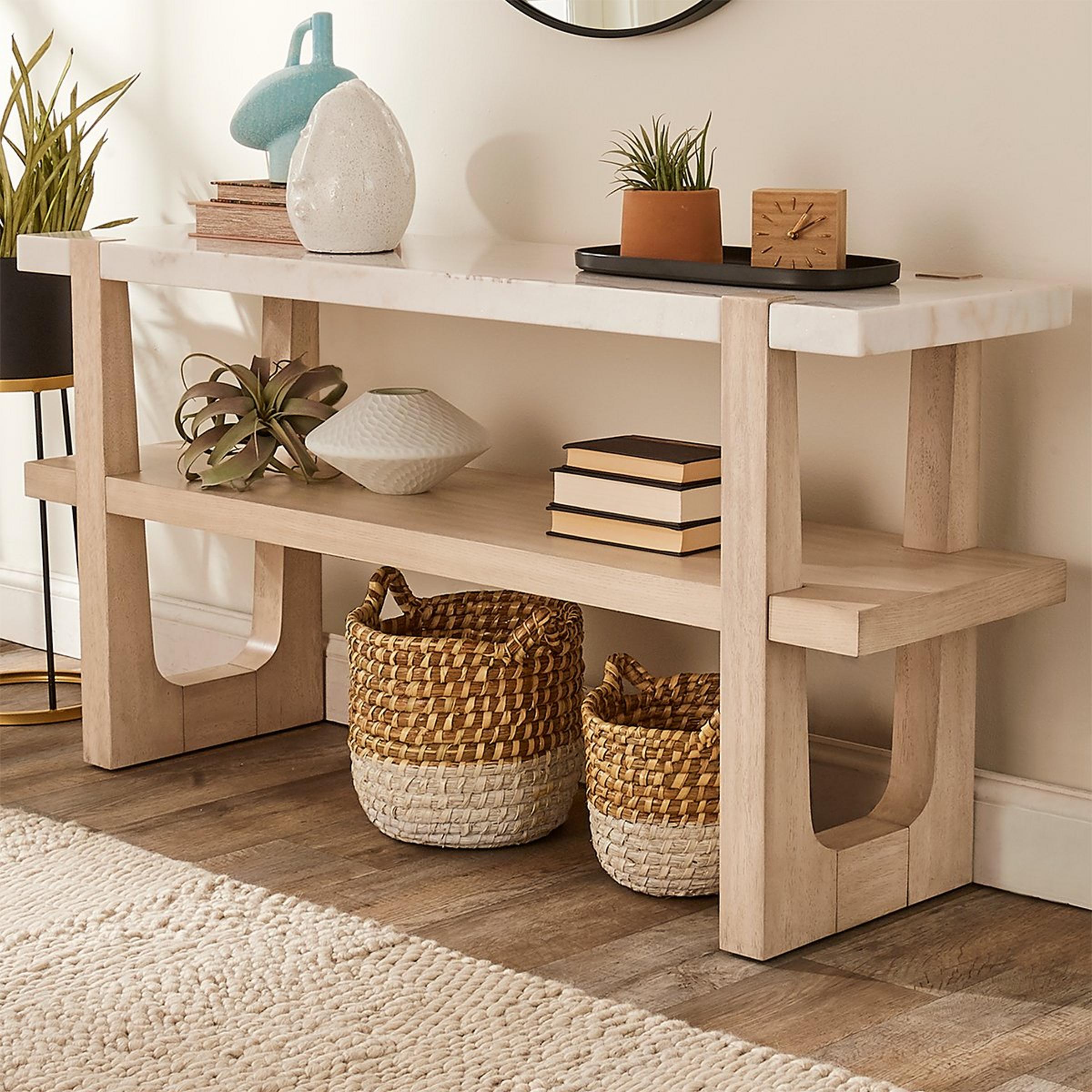 The Zion Console has a soft aesthetic with a transitional motif. The light gray washed wooden base is slightly curved while still offering a linear look. Topped with white marble and adorned by a center shelf, this piece has an effortless elegance and is perfect for your hallway. Place a center mirror with buffet lamps on top and use the center shelf for decorative accessories to best accessorize this piece.